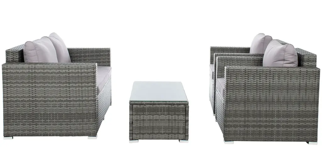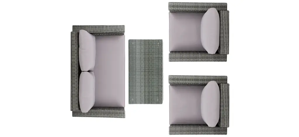 The Brielle 4-pc. Patio Set perfectly pairs clean lined geometry with rich, flowing texture, elevating your outdoor decor to new heights of sophistication. Brielle's woven frames are beautifully juxtaposed with plush cushions, and its glass topped coffee table provides ample room for drinks or tapas.