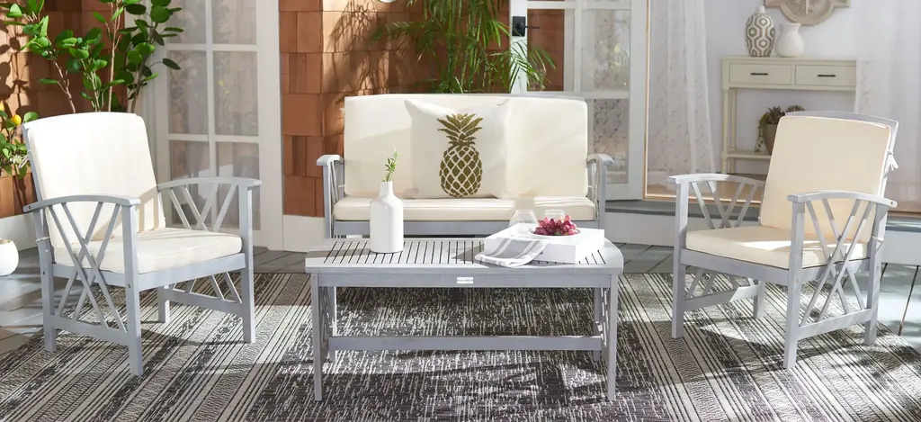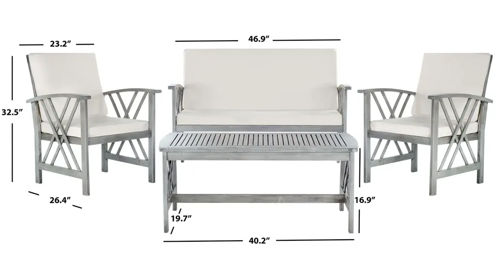 A distinctive double X motif adorns the sides of the Bryce 4-pc. Patio Set for a luxe transitional look. Masterfully crafted of sustainable acacia wood, the set comes with all weather cushions.