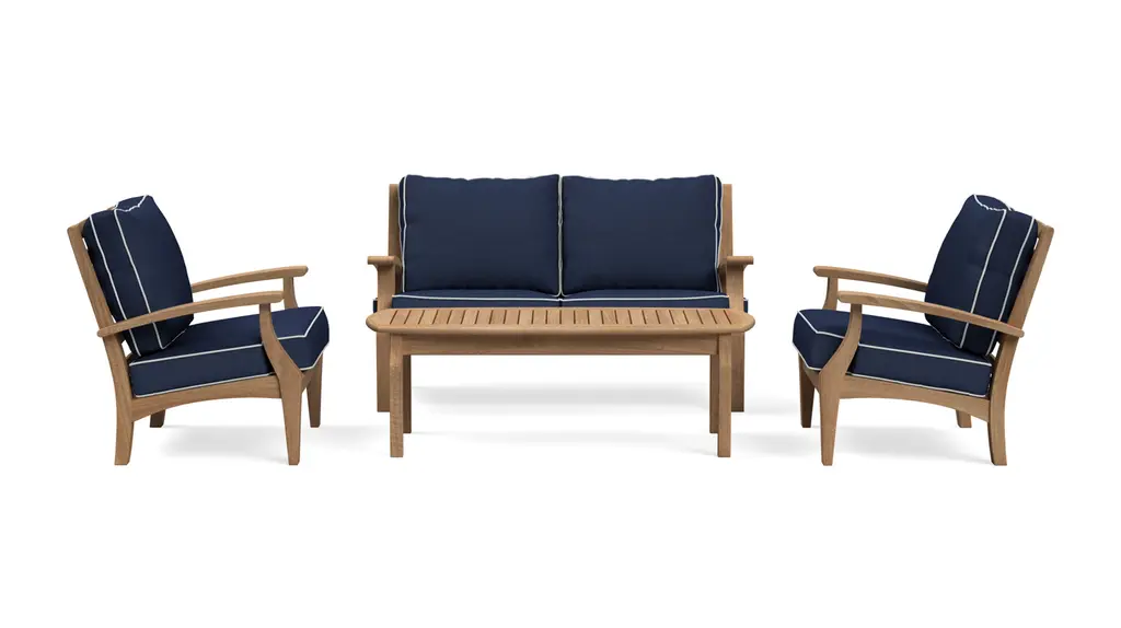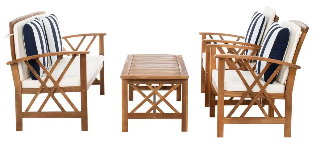 A distinctive double X motif adorns the sides of the Bryce 4-pc. Patio Set for a luxe transitional look. Masterfully crafted of sustainable acacia wood, the set comes with all weather cushions.