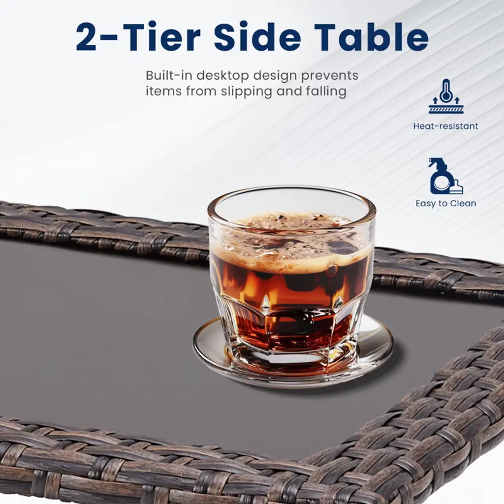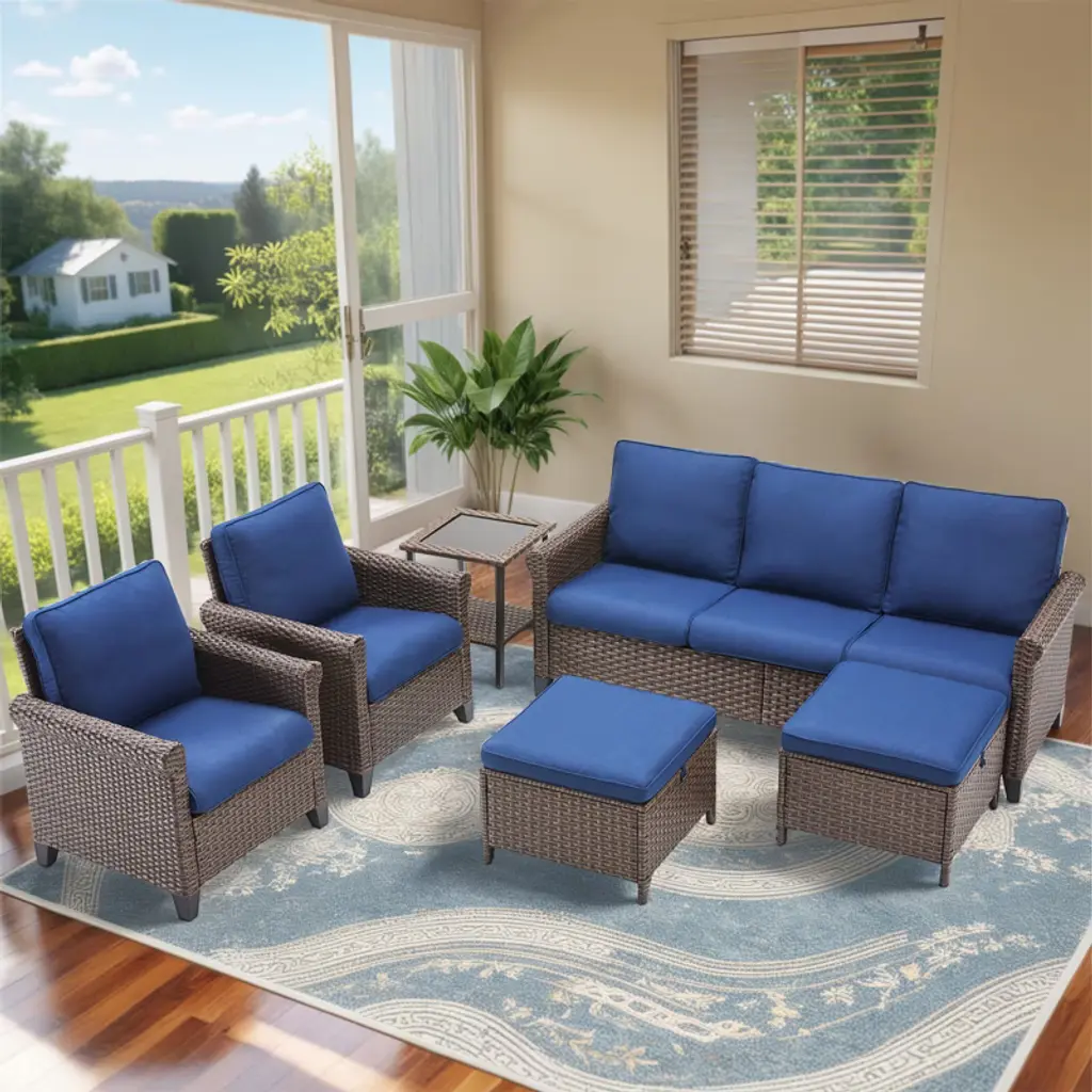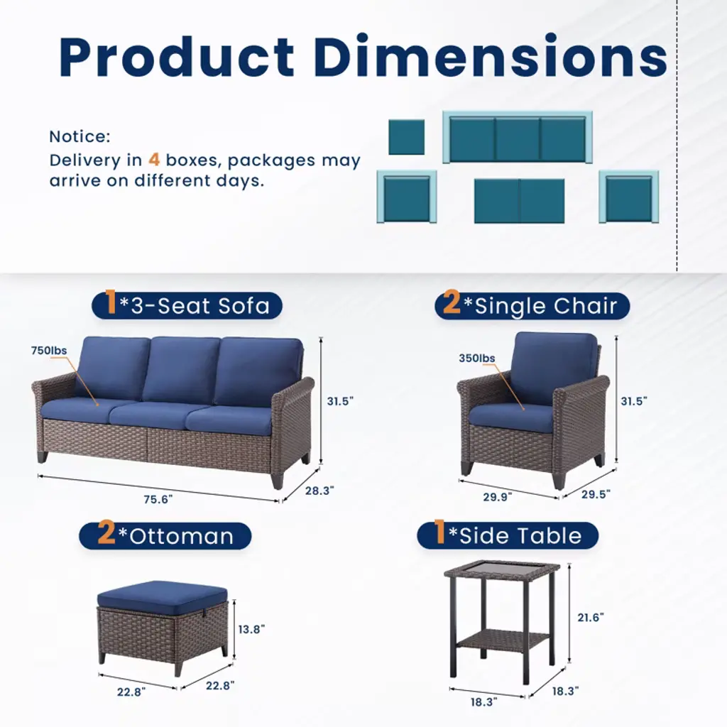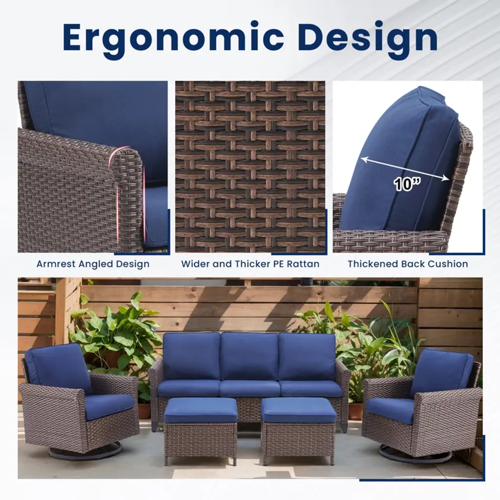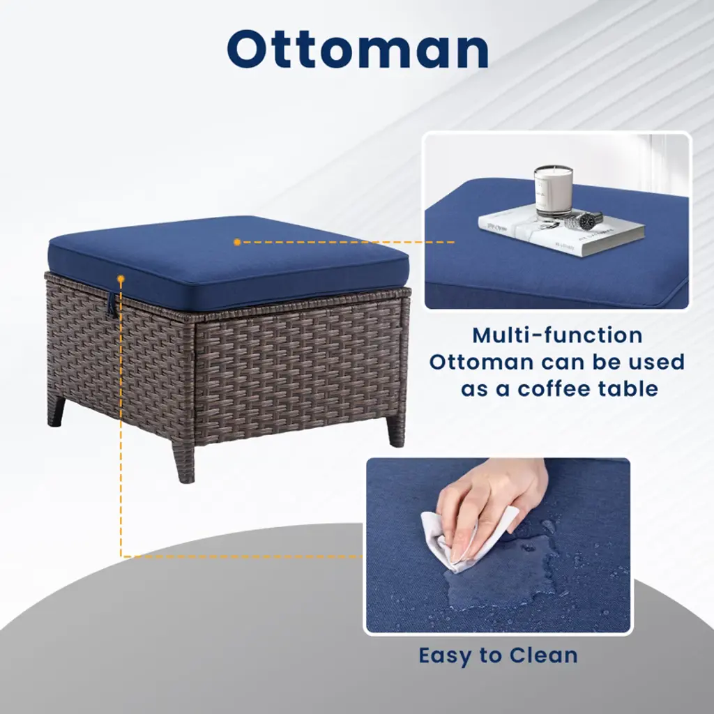 Create a stylish and comfortable outdoor retreat with our 5-Piece Outdoor Furniture Set. This set includes one sofa, two single chairs, two ottomans, and one coffee table, perfect for patios, gardens, or balconies. Designed to offer both elegance and functionality, this set will transform your outdoor space into a cozy, inviting oasis. Crafted from durable handwoven wicker and supported by a sturdy powder-coated steel frame, this set is built to withstand the elements while adding a touch of sophistication to your outdoor decor. The weather-resistant cushions, made from Olefin fabric, are designed to resist fading, mildew, and wear, ensuring lasting comfort and vibrant color even after exposure to the sun and rain. The ottomans are versatile and can be used as footrests, extra seating, or even as side tables for drinks and snacks. The sofa and single chairs offer ample seating, perfect for relaxation or entertaining guests. With its low-maintenance design, this set will enhance your outdoor experience, allowing you to relax and entertain with ease.