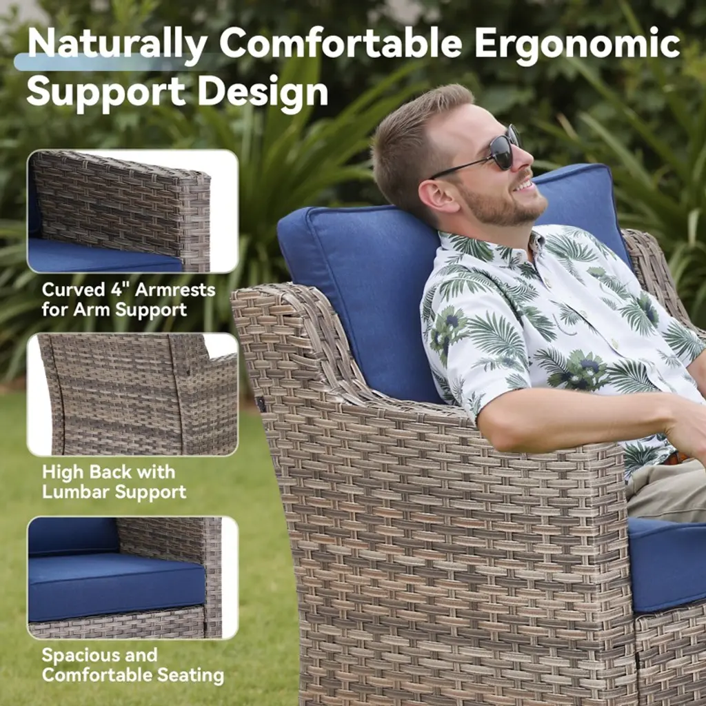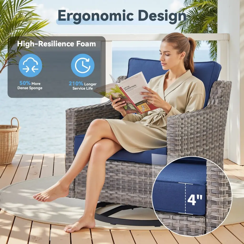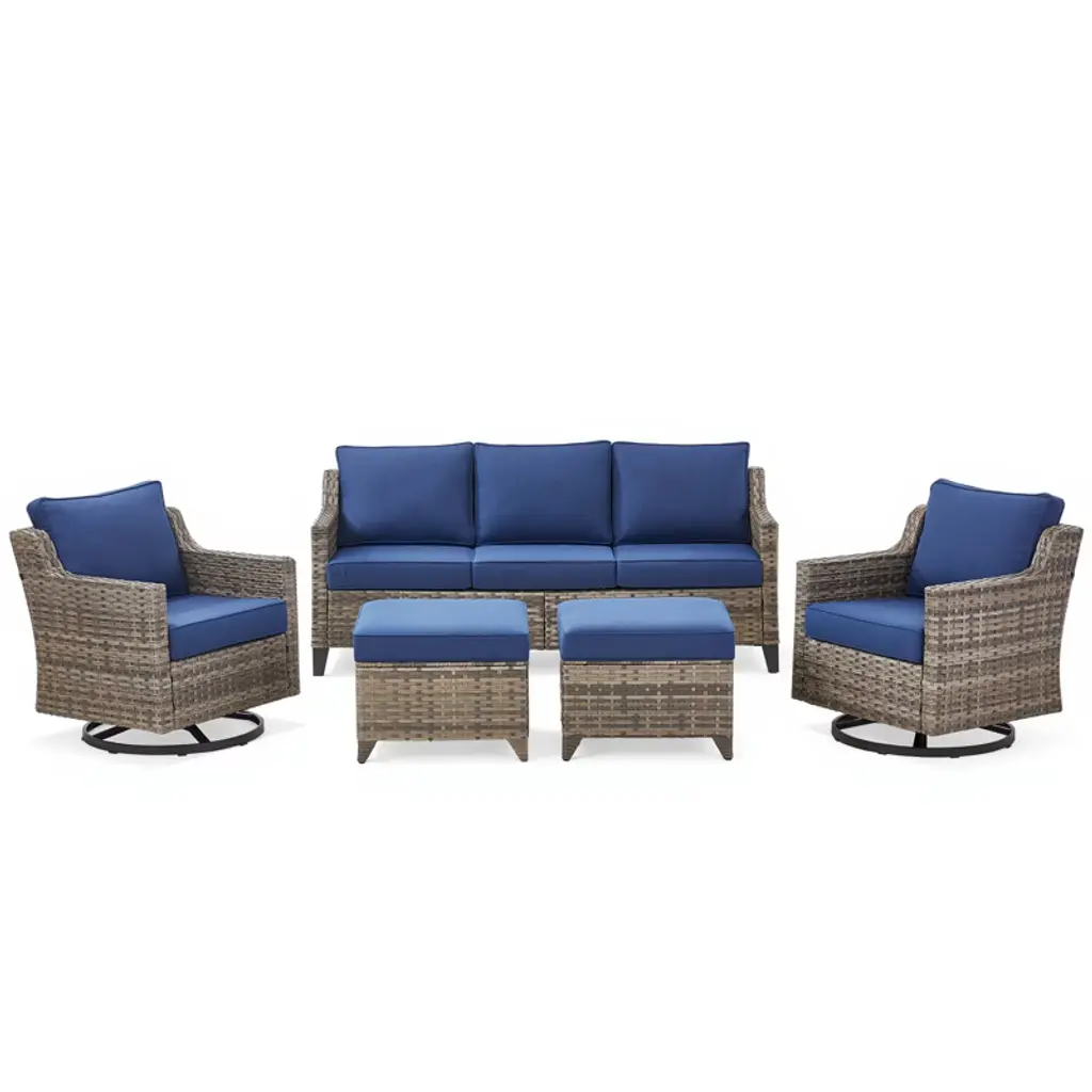 Elevate your outdoor living with the Buenhomino 5-Piece Patio Set. This stylish rattan wicker conversation set includes a deep-seating sofa, two 360° swivel glider chairs, and two multi-use ottomans. Designed for ultimate comfort and durability with thick, plush cushions and all-weather PE wicker, it's the perfect centerpiece for your garden, patio, or poolside.