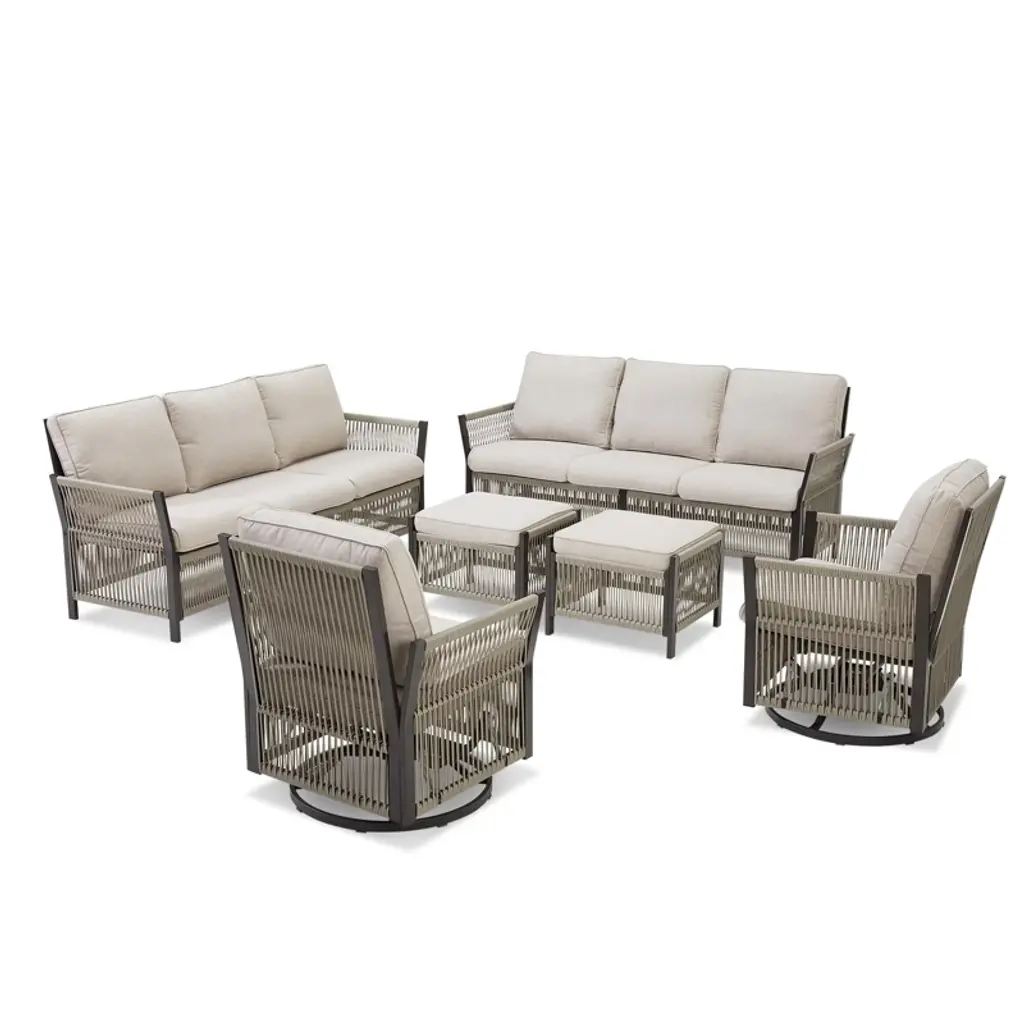 Elevate your outdoor living space with this luxurious 6-piece seating set, designed for both comfort and style. Crafted with handwoven driftwood resin wicker and complemented by durable, weather-resistant cushions, this set offers a blend of elegance and longevity. The included sofa, swivel chairs, and ottomans provide ample seating for relaxation, while the UV-resistant fabric and powder-coated steel frame ensure your furniture looks stunning for years to come. Perfect for a garden, balcony, or poolside, this set creates a sophisticated retreat for any outdoor area.
