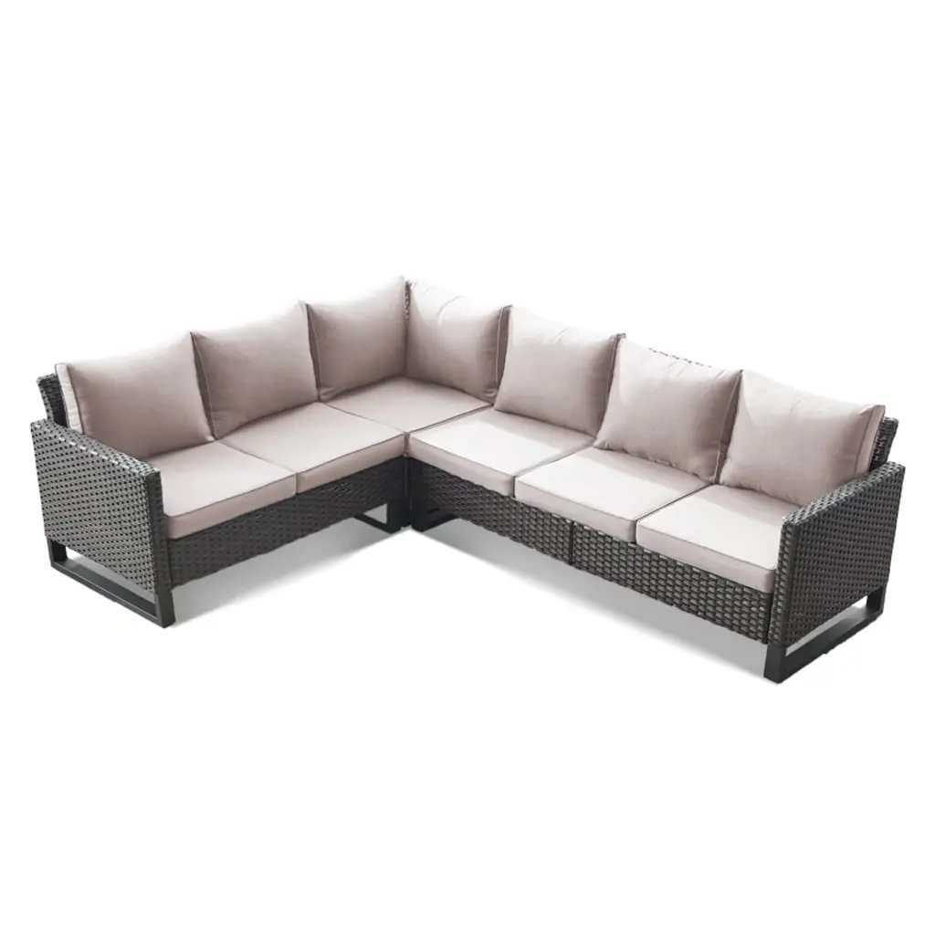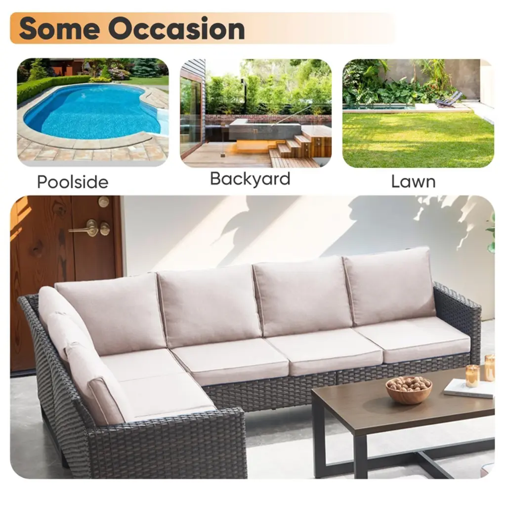 Upgrade your outdoor space with the Buenhomino 6-Piece Outdoor Sectional Sofa! This L-shaped patio furniture set features weather-resistant PE wicker, thick cushions, and a rust-proof steel frame for durability. Perfect for decks, patios, or poolside lounging, its modular design allows flexible arrangements. Relax in style with all-weather comfort!