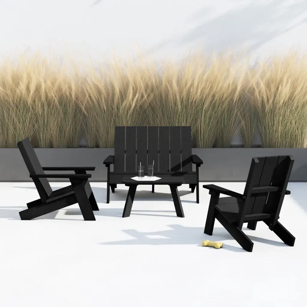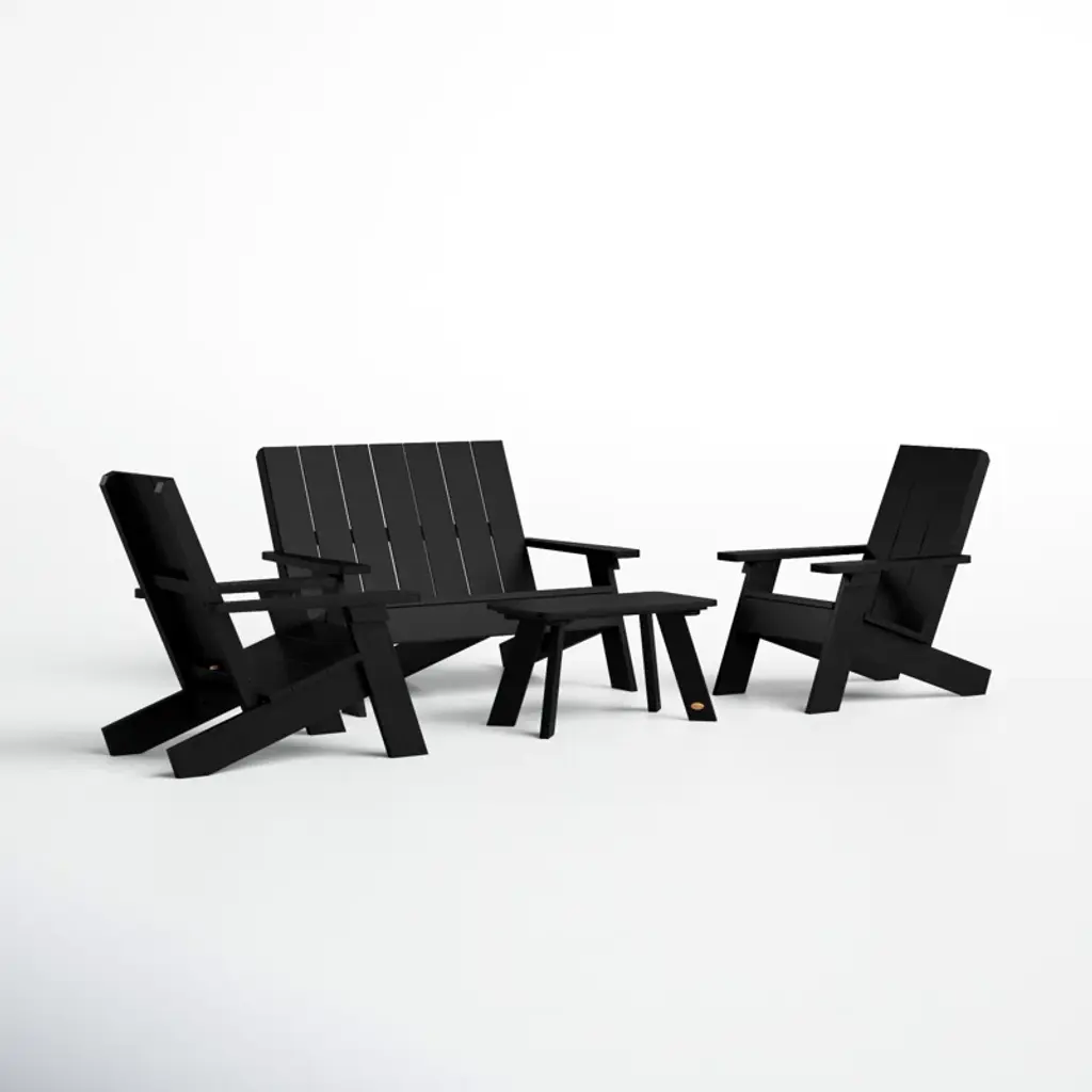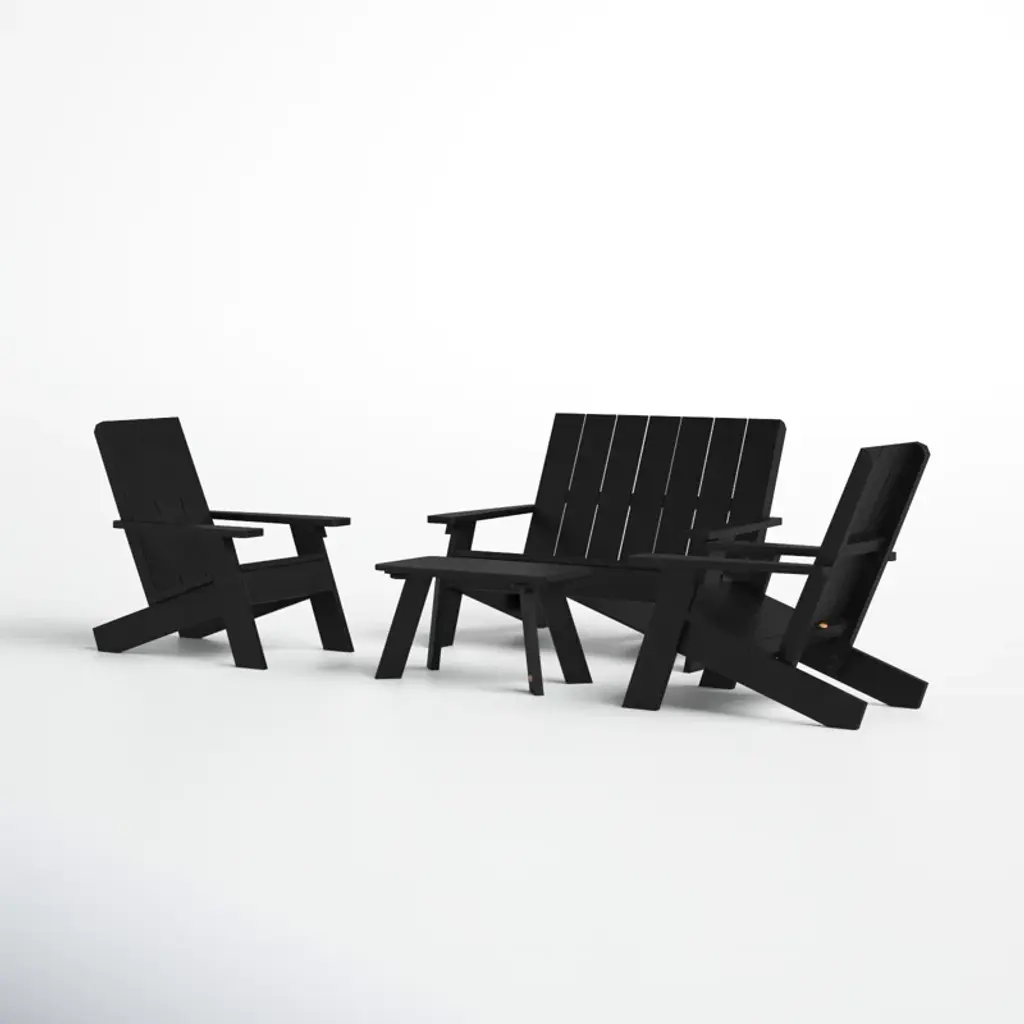 The greater outdoors. This set includes two armchairs + a loveseat with laid-back Adirondack silhouettes that evoke evening bonfires, plus a table to hold the s’mores supplies. They’re made in the USA from weather-resistant resin that mimics the look of wood but stands up to the elements year-round.