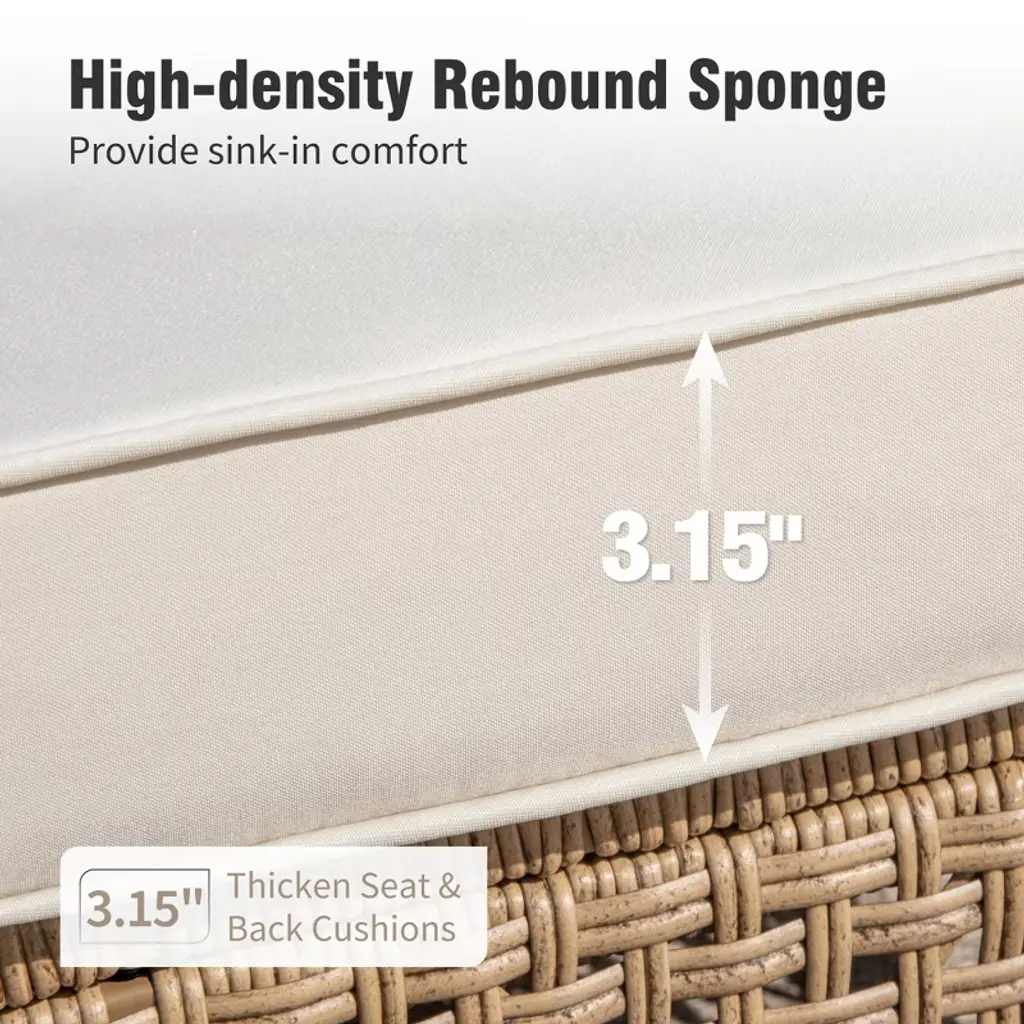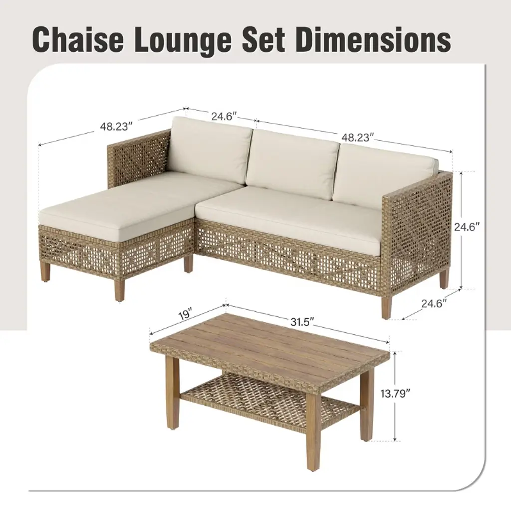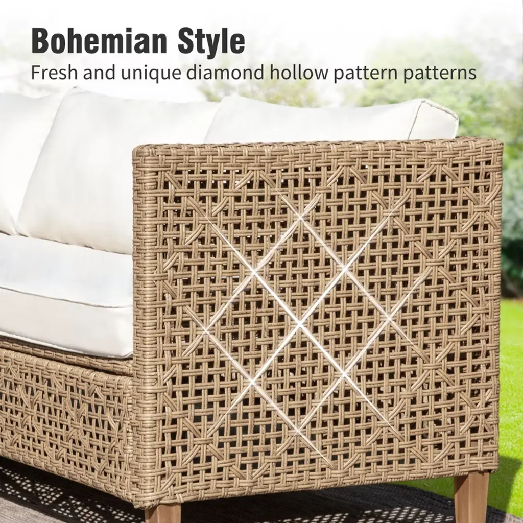 Elevate your outdoor living with this bohemian-inspired rattan sofa set, blending style and functionality effortlessly. The handwoven rattan design adds a chic, free-spirited vibe, while the sturdy acacia wood frame ensures durability and natural elegance. Enjoy added convenience with the spacious double-layer storage table—perfect for keeping gatherings organized. Designed for comfort and resilience, the weatherproof plastic wood tabletop is both safe and low-maintenance, making it ideal for relaxing under the sun or stars. Specification:Materials: Rattan, Acacia Wood, Metal3-Seater Sofa: 72.83"W x 24.6"D x 24.6"HCoffee Table: 31.5"W x 19"D x 13.79"HCleaned easily with warm water and mild soap.Store your cushions temporarily under a covered area.