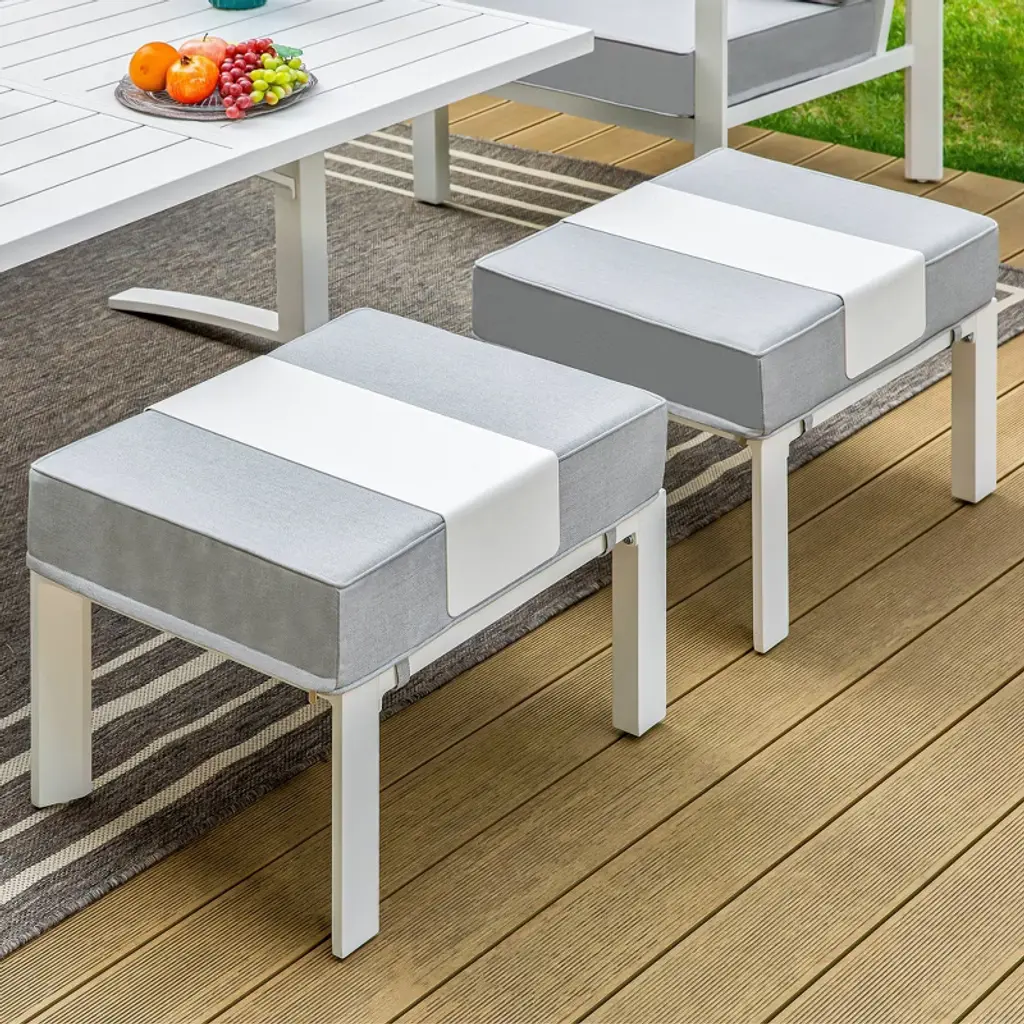 Upgrade your outdoor space with this modern sofa set, blending sleek white aluminum frames with plush gray cushions for contemporary elegance. Designed for lasting comfort and durability, the weather-resistant construction withstands sun, rain, and wind, while deep seats and ergonomic support invite relaxation. Perfect for hosting gatherings or enjoying quiet moments, this low-maintenance set combines style and function to create your ideal outdoor retreat.Features:Waterproof, stain-resistant, and oil-repellent CUSHION PRO® FabricNon-slip nylon hook-and-loop fasteners for cushionsOttoman includes sturdy plate for placing items900lbs weight capacity for 3-seater sofaRemovable zippered cushion coversSpecification:Color: Light GrayMaterial: ;Aluminum, Fabric, Sponge3-seat Sofa Size: 75.6"L x 32.3"W x 32.3"HArmrest Chair Size: 28.3"L x 32.3"W x 32.3"HOttoman Size: 24"L x 18.9"W x 12.6"HDining Table Size: 59.1"L x 35.4"W x 25.6"H