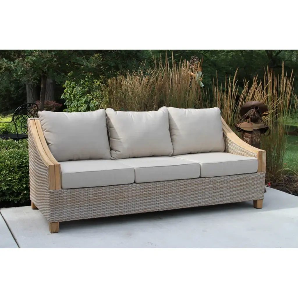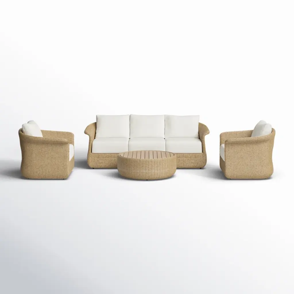 This 4-piece outdoor seating group has the quality materials and coastal farmhouse look we love. Each outdoor furniture piece (it comes with one patio sofa, two chairs with cushions, and a coffee table) has a solid teak wood frame that's weather-resistant and wrapped in wicker. They're all hand-woven around durable powder-coated aluminum frames, so you can count on them lasting for years to come. Plus, Sunbrella fabric and stainless steel hardware only add to this patio set's sturdiness.