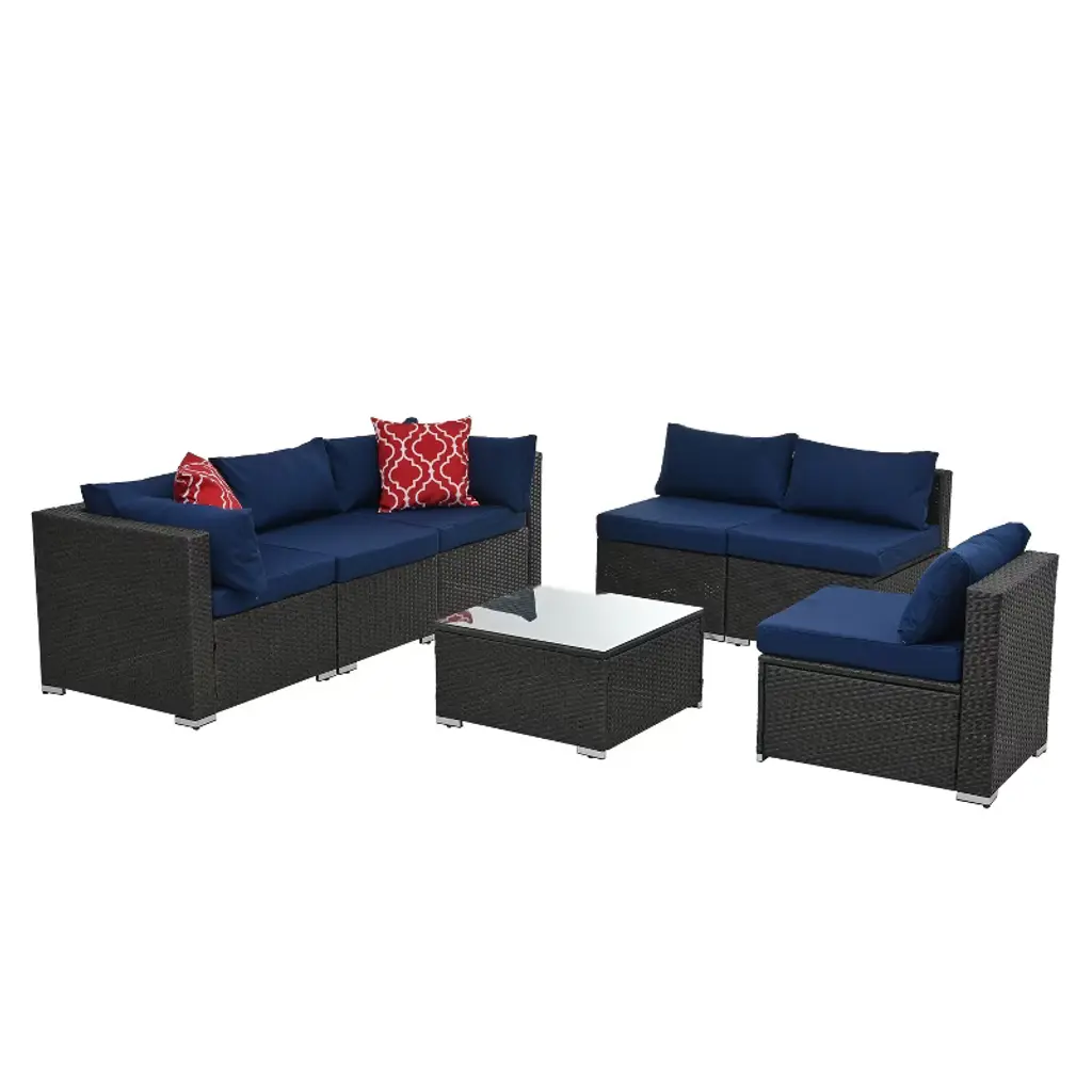 Weatherproof outdoor furniture set Engineered for endurance, this outdoor furniture set powder-coated steel frames and UV-resistant double-weave PE wicker to defy rain, sun, and heavy use. Plush, generously padded cushions and included accent pillows deliver all-day comfort, perfect for poolside relaxation or garden gatherings. Modular seating with secure buckles allows customizable configurations, paired with a sleek tempered glass table for easy access to drinks or snacks. Removable, water-repellent cushion covers simplify cleaning, while the scratch-resistant glass wipes clean in seconds. Versatile enough for intimate chats or lively entertaining, this durable yet adaptable set blends rugged resilience with effortless style for any outdoor space.