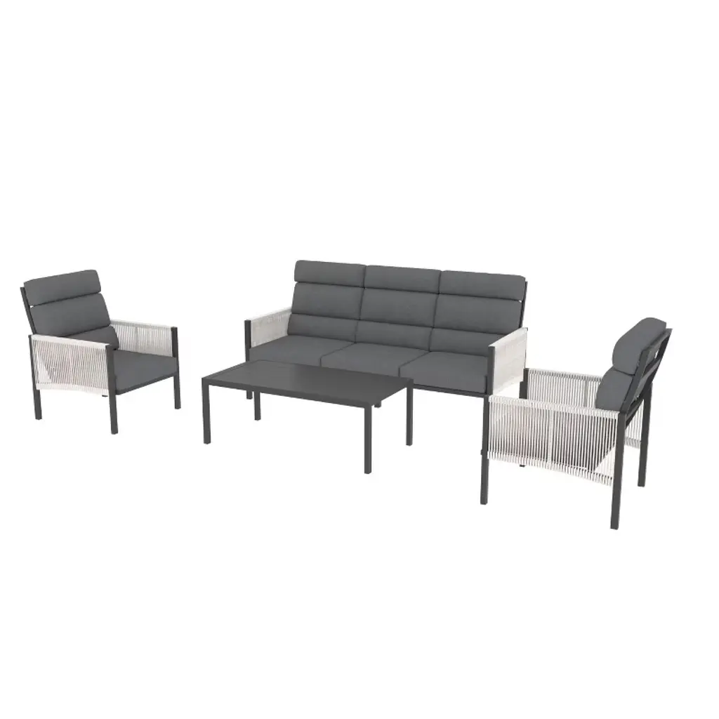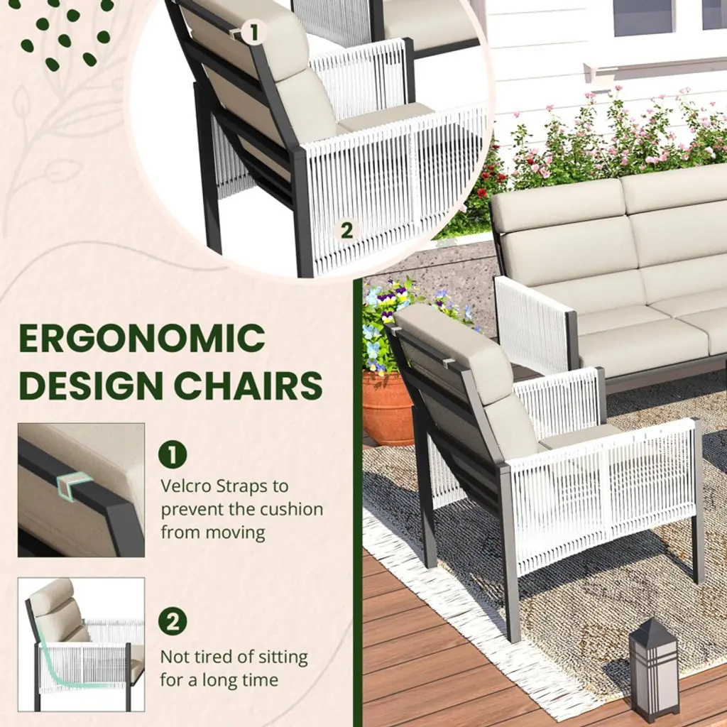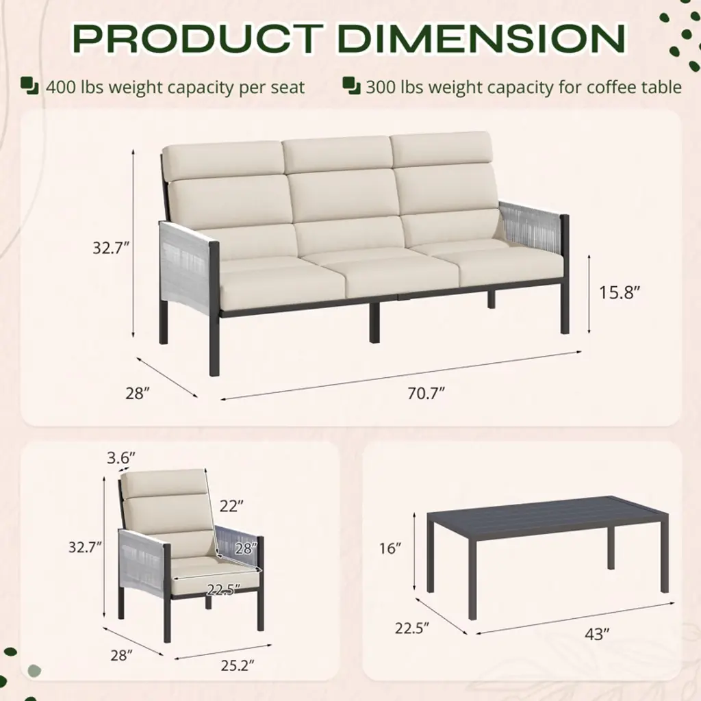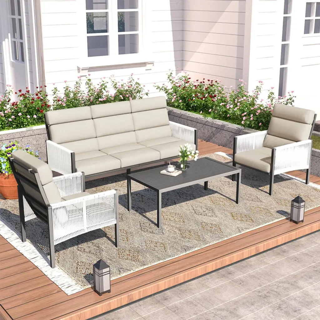 Enhance your outdoor living with this stylish and comfortable 4-piece patio set, designed for ultimate relaxation in your backyard, porch, or poolside. The set includes a plush sofa, matching chairs, and a convenient side table, all crafted with rust-resistant materials to ensure long-lasting durability. Featuring innovative design and superior comfort, this set is perfect for lounging, entertaining, or simply enjoying the outdoors.