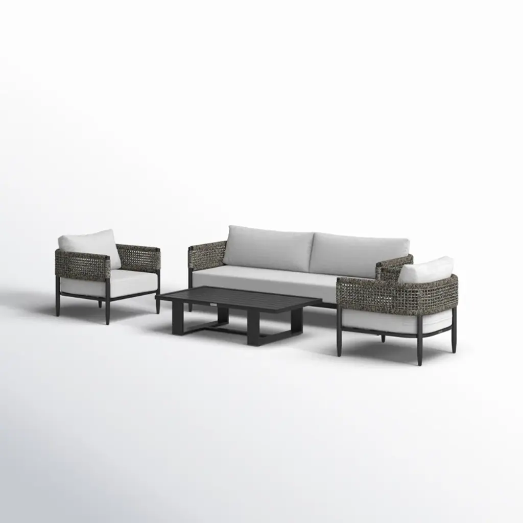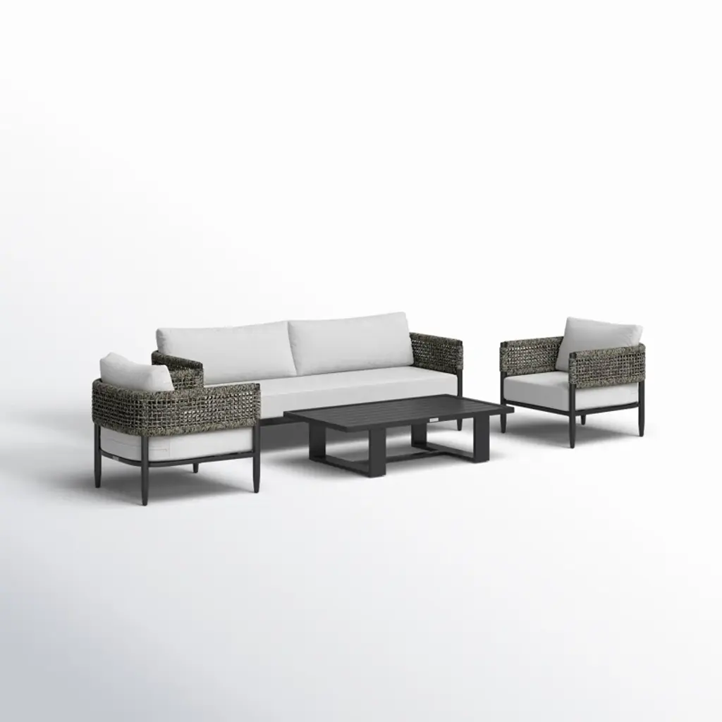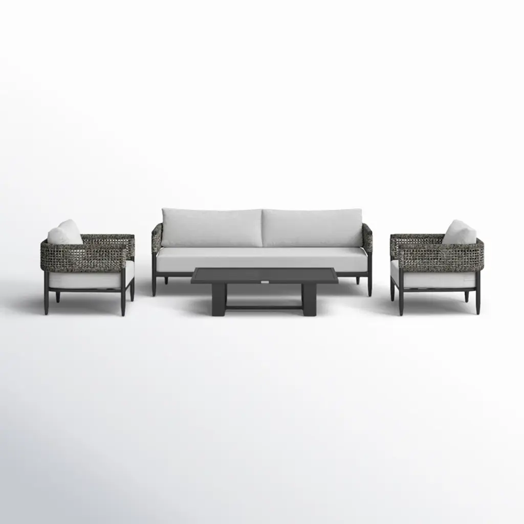 Kick back with your crew on this fantastic four-piece set, perfect for patio gatherings. Each piece is artfully crafted from sturdy aluminum, wrapped in a unique polyester rope weave, creating a distinct and inviting aesthetic. The seating capacity of five means there's plenty of room to lounge with friends or family. Plus, the cushions are water, stain, and UV-resistant for year-round use. The cherry on top? A nifty coffee table for all your refreshments. So, why wait? Your outdoor oasis is just a set away!