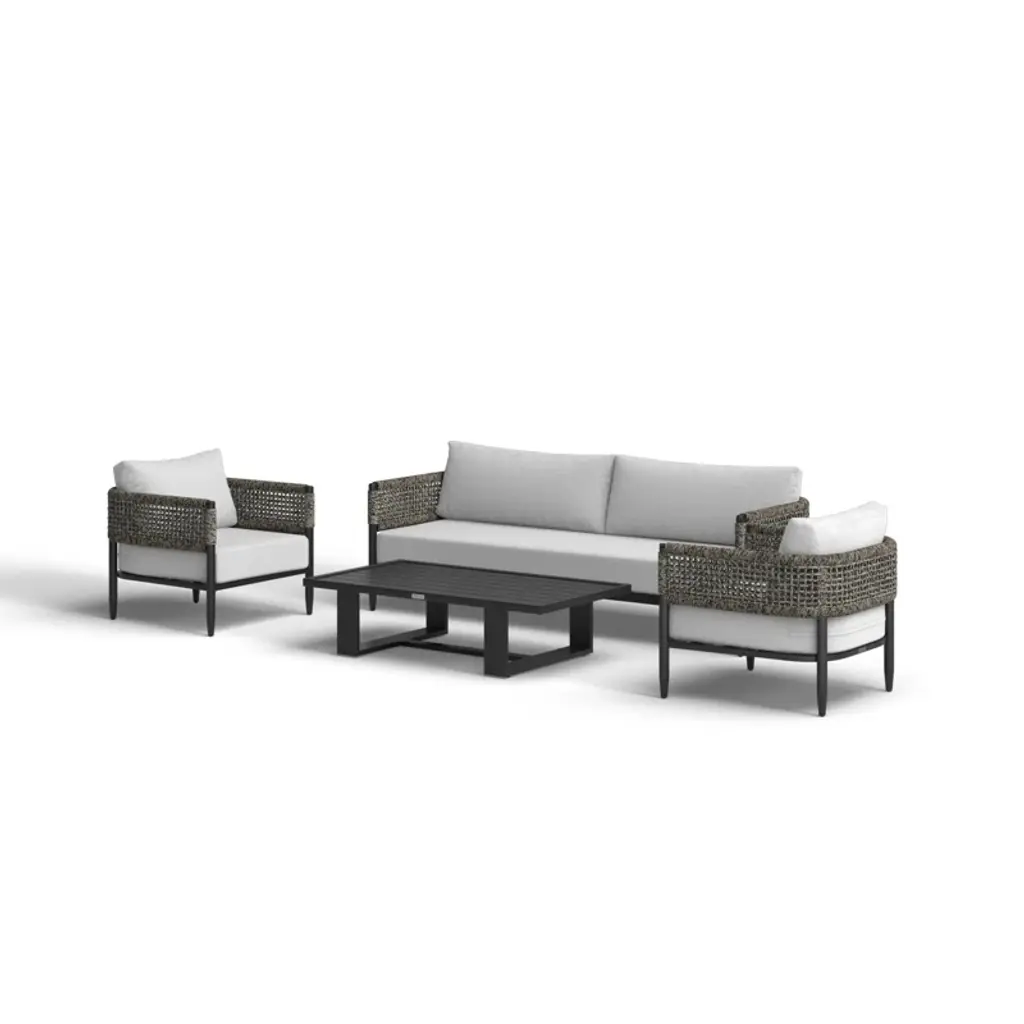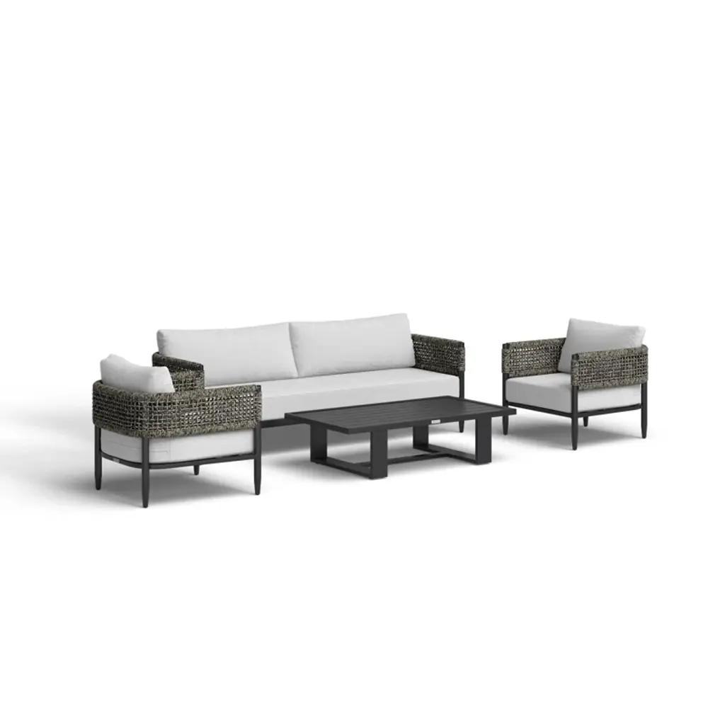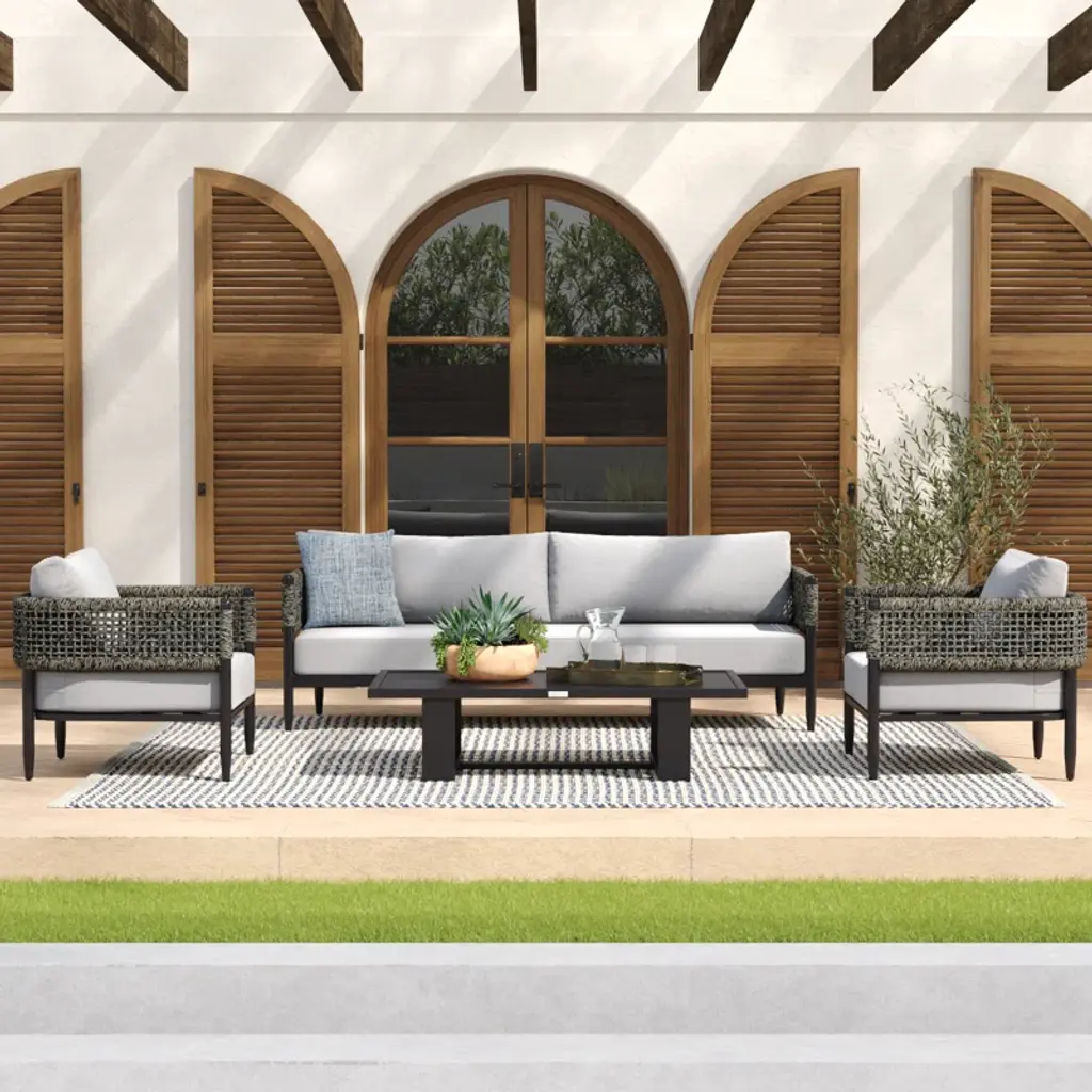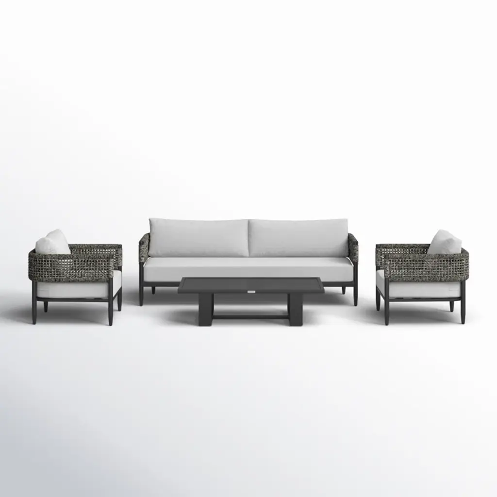 Kick back with your crew on this fantastic four-piece set, perfect for patio gatherings. Each piece is artfully crafted from sturdy aluminum, wrapped in a unique polyester rope weave, creating a distinct and inviting aesthetic. The seating capacity of five means there's plenty of room to lounge with friends or family. Plus, the cushions are water, stain, and UV-resistant for year-round use. The cherry on top? A nifty coffee table for all your refreshments. So, why wait? Your outdoor oasis is just a set away!