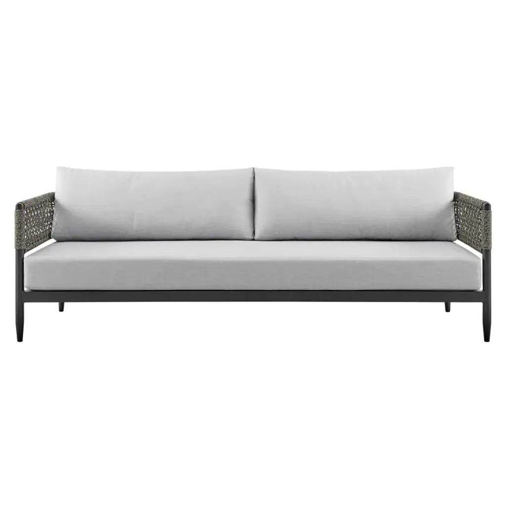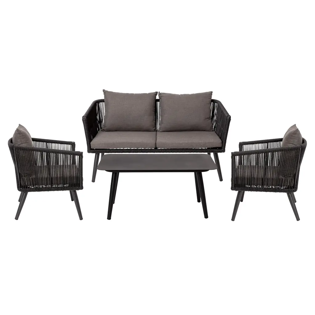 Chervonne 4 Piece Outdoor Conversation Set In Black Aluminum And Rope With Light Gray Fabric Cushions