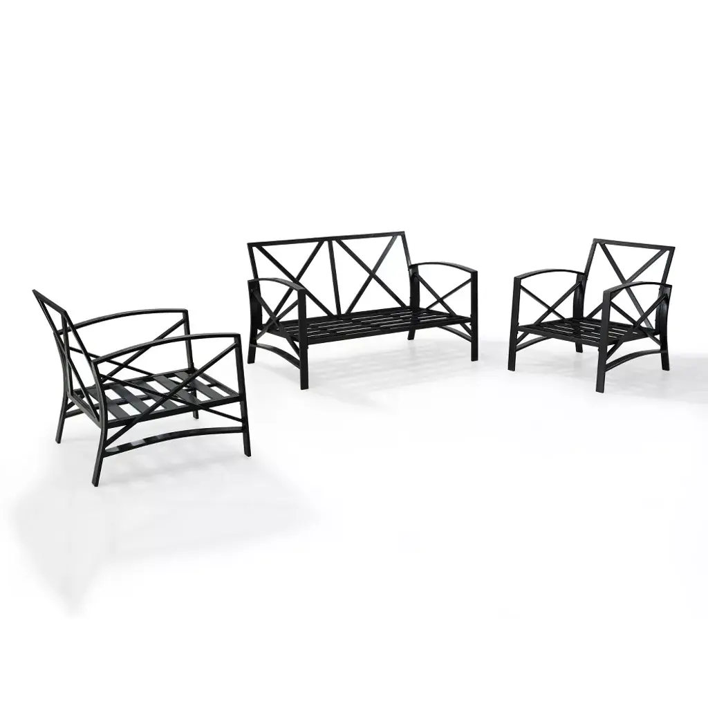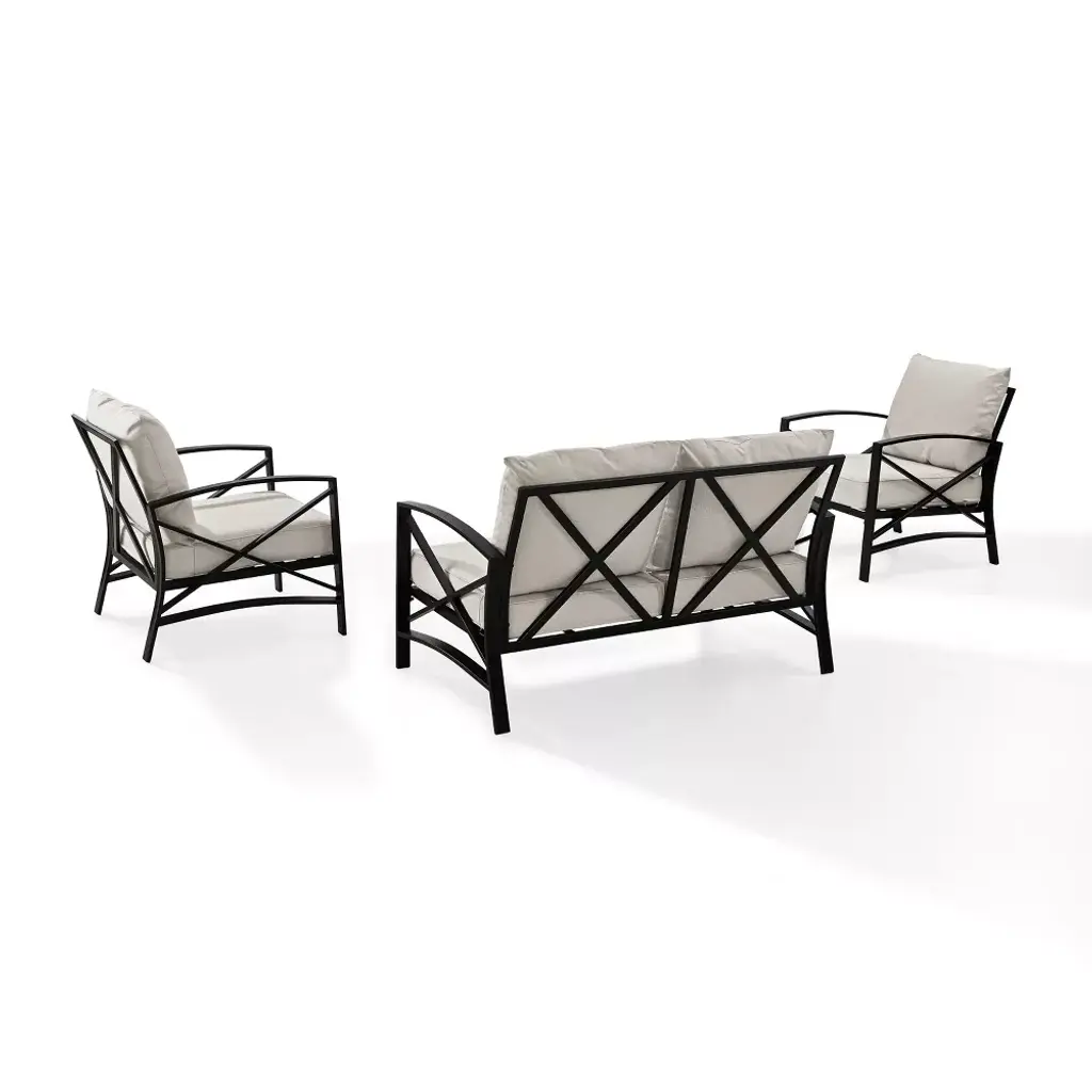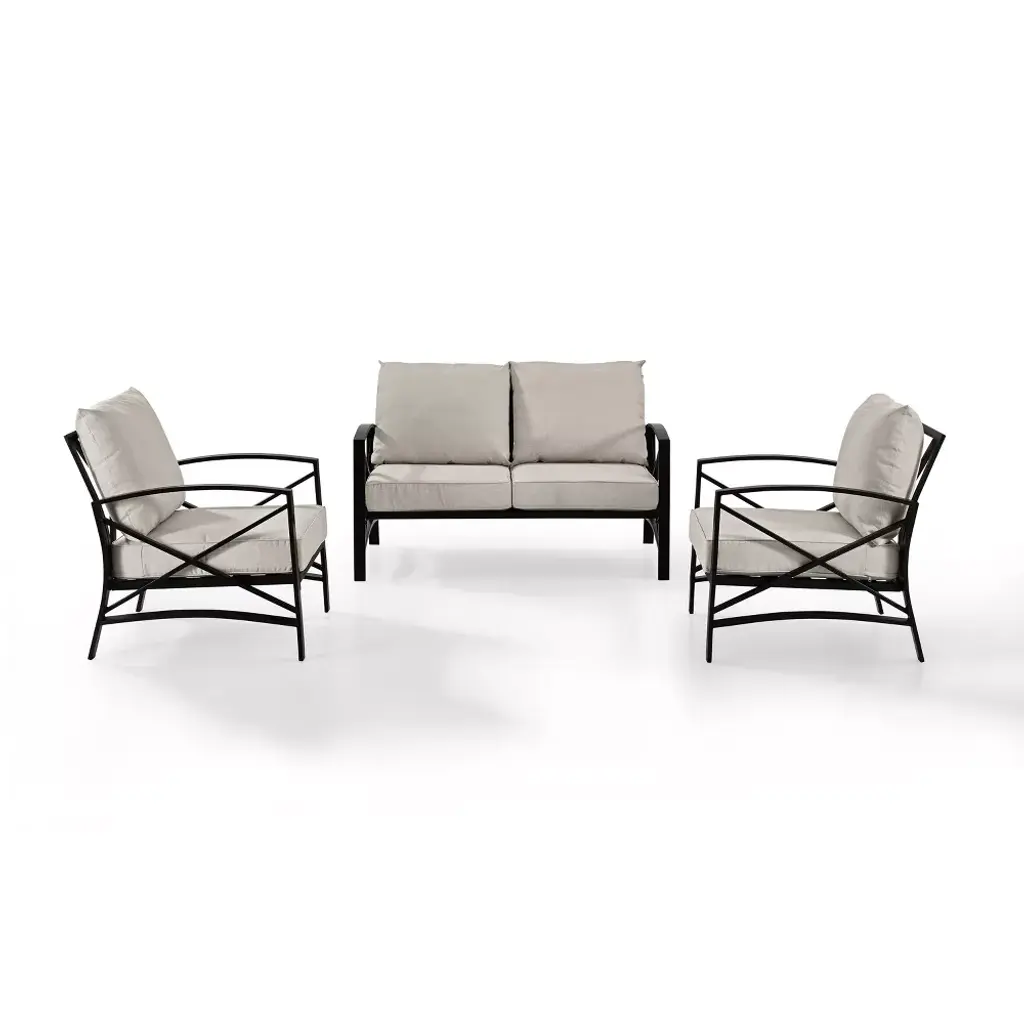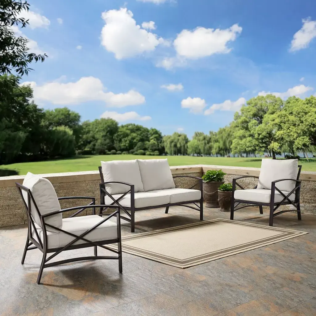 Add simple elegance to your outdoor area with the Kaplan Collection. This three-piece set is made with rust protected premium steel with an oil bronze finish. The cushions have a moisture-resistant and UV-resistant cover to protect against fading. This set includes a loveseat and two chairs. It is easy to assemble and even easier to enjoy.