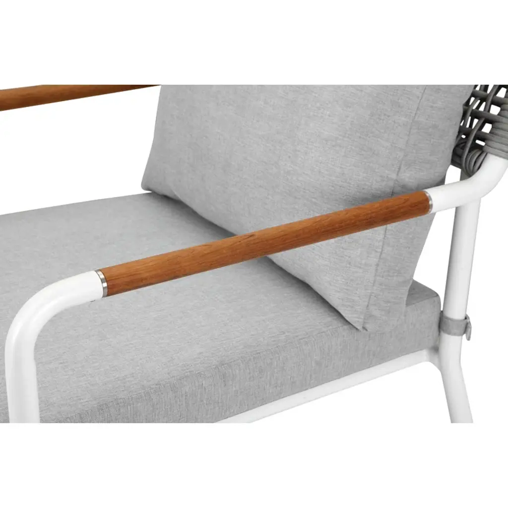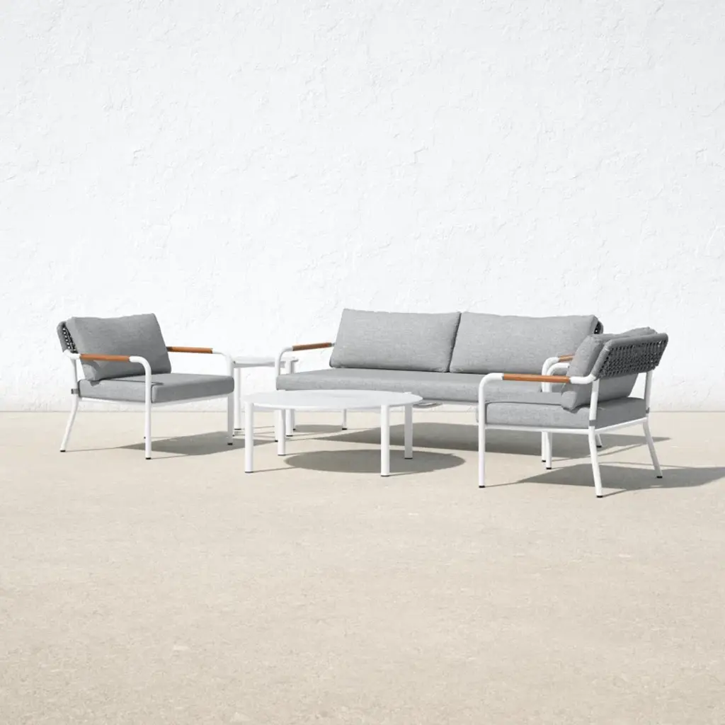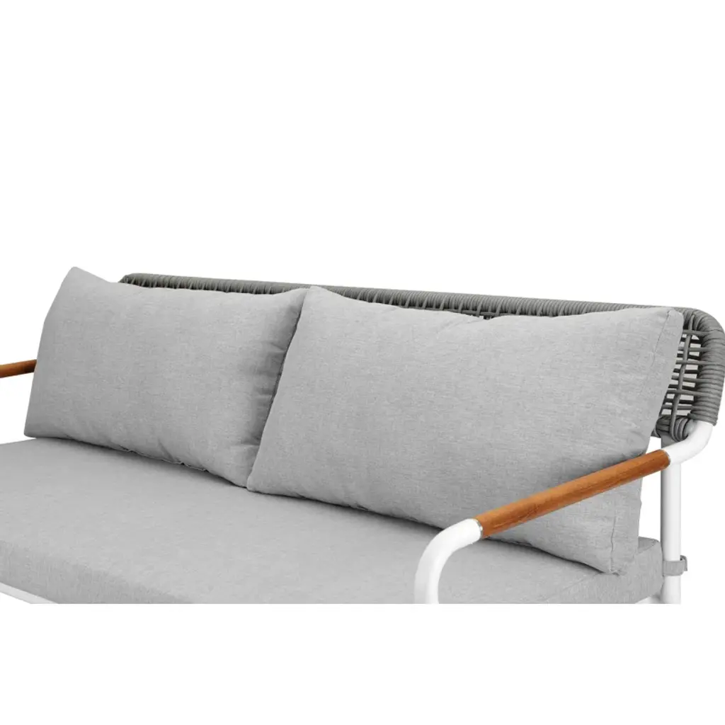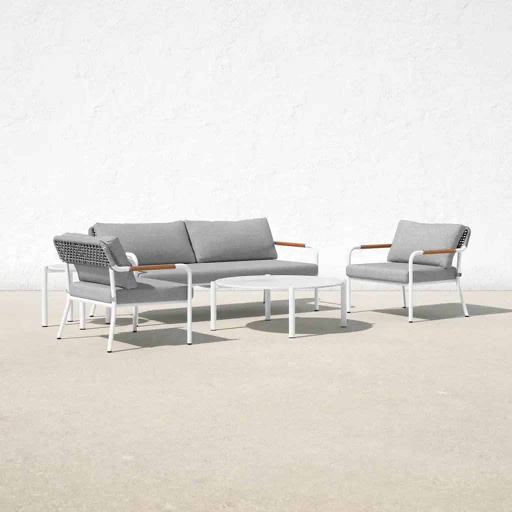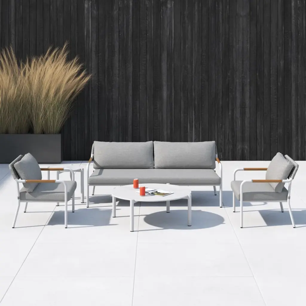 Built with powder-coated aluminum frames, this outdoor set layers in mixed-material details for a quirky modern look. Two tables are topped by marble-effect ceramic, while the sofa + chairs showcase teakwood armrests and woven rope accents. Attachable cushions in removable covers soften the seats.