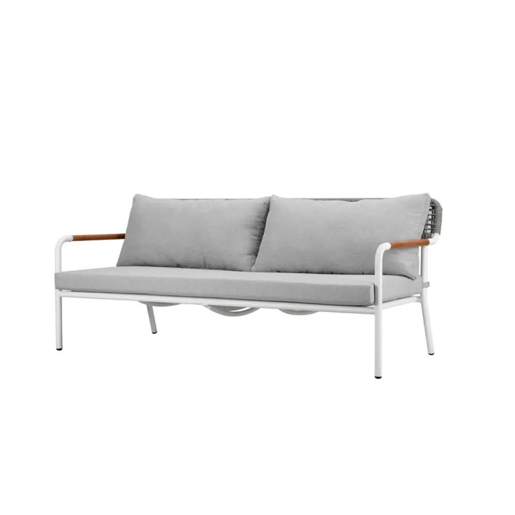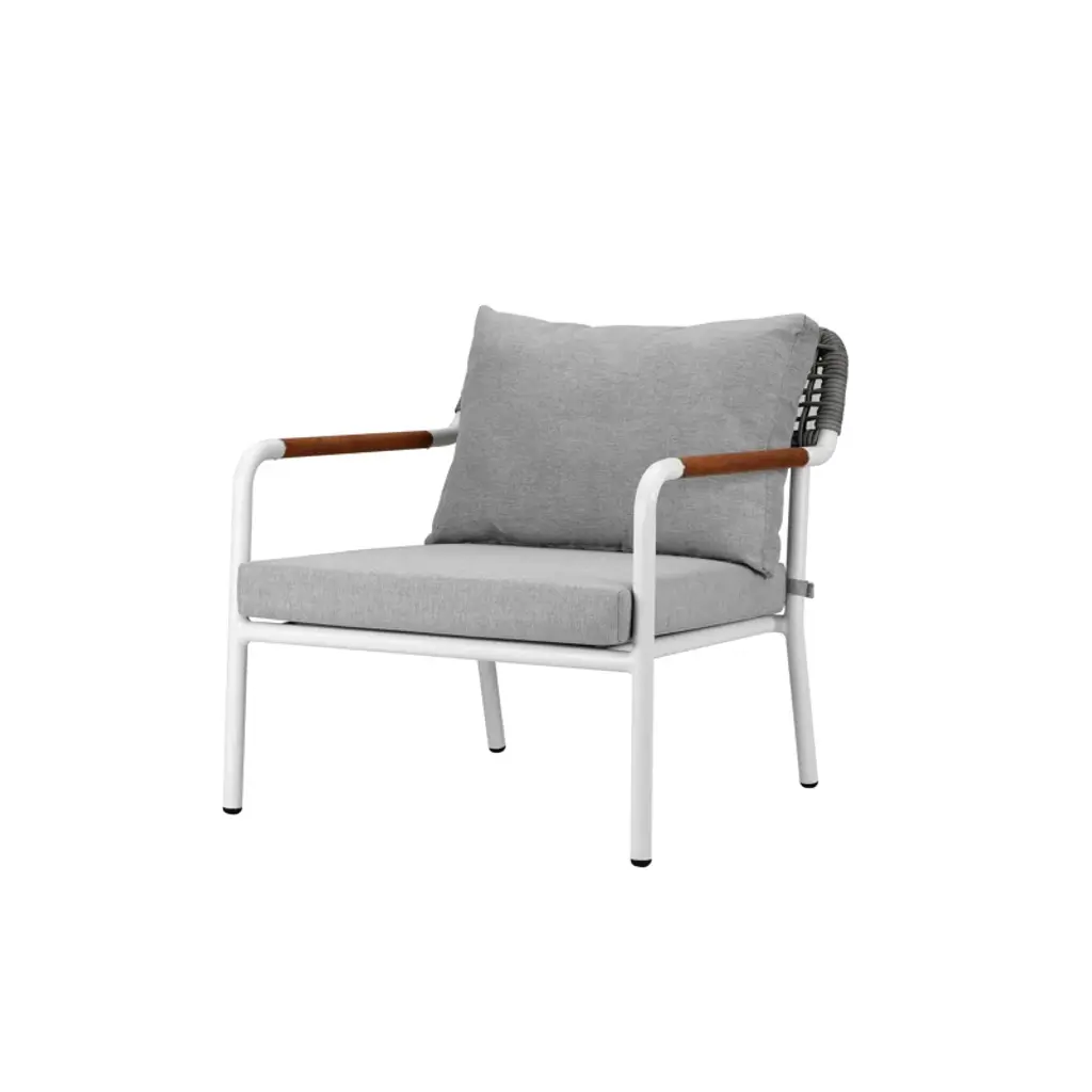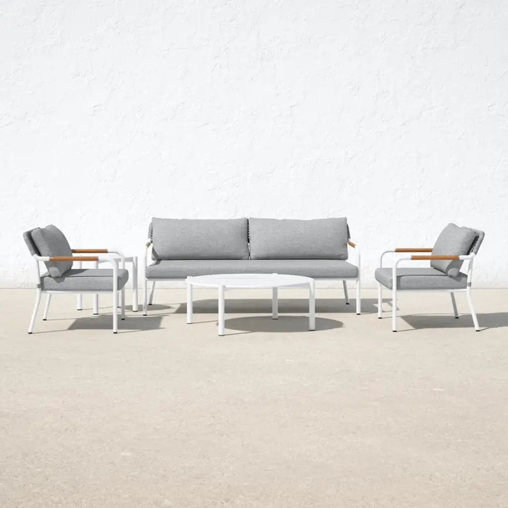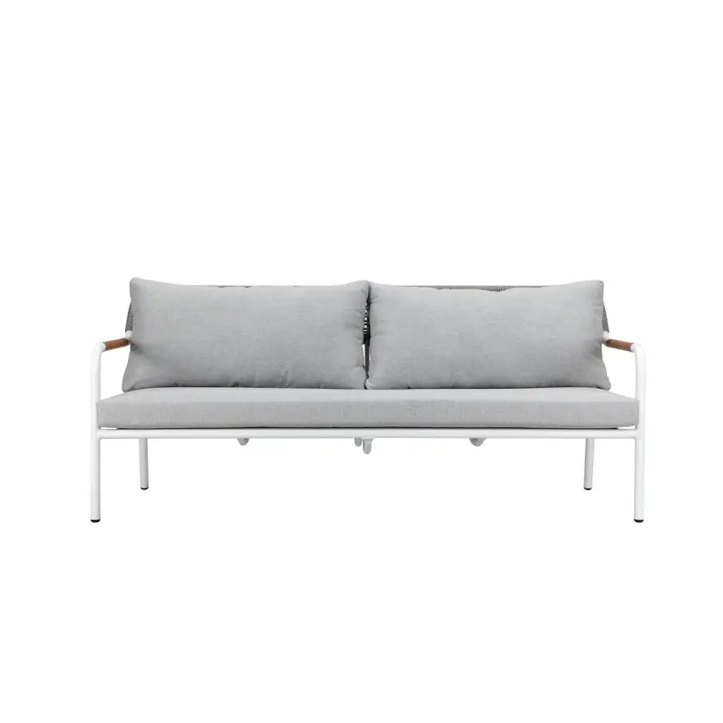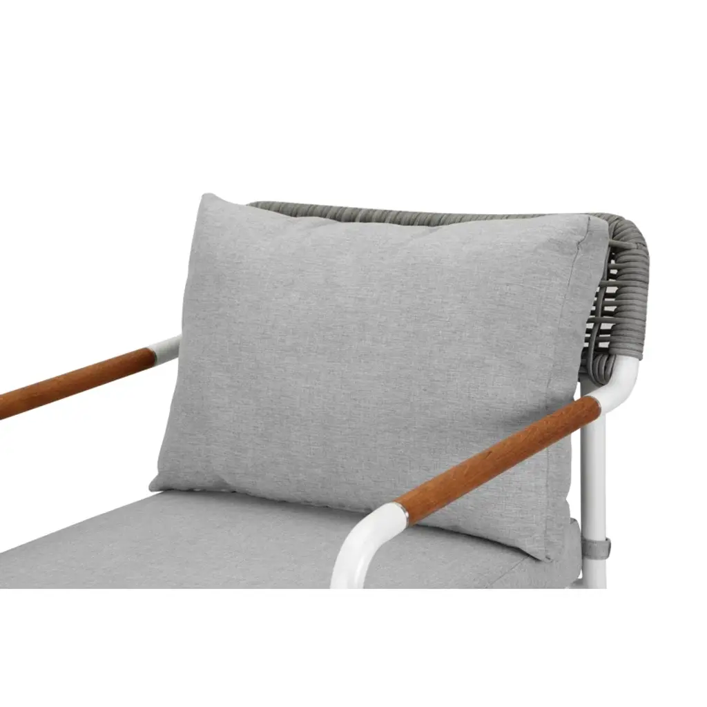 Built with powder-coated aluminum frames, this outdoor set layers in mixed-material details for a quirky modern look. Two tables are topped by marble-effect ceramic, while the sofa + chairs showcase teakwood armrests and woven rope accents. Attachable cushions in removable covers soften the seats.