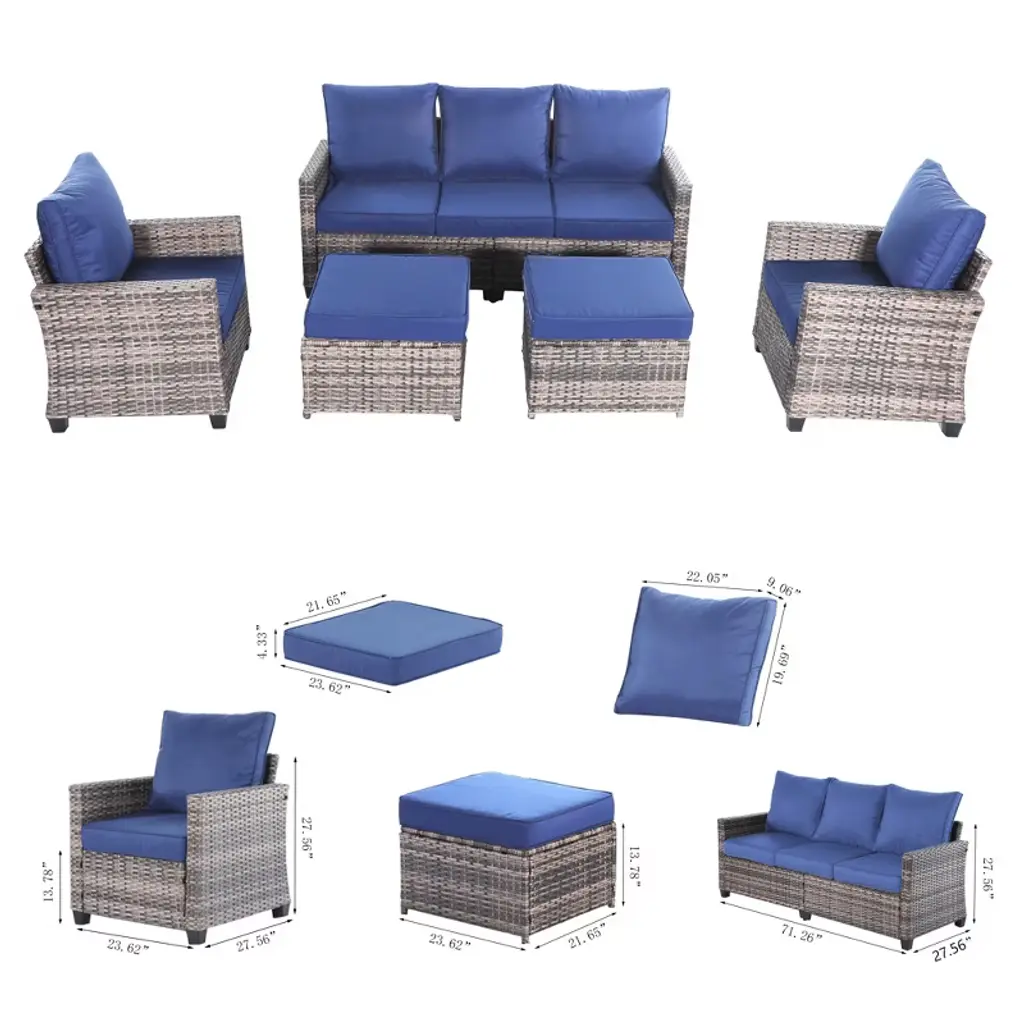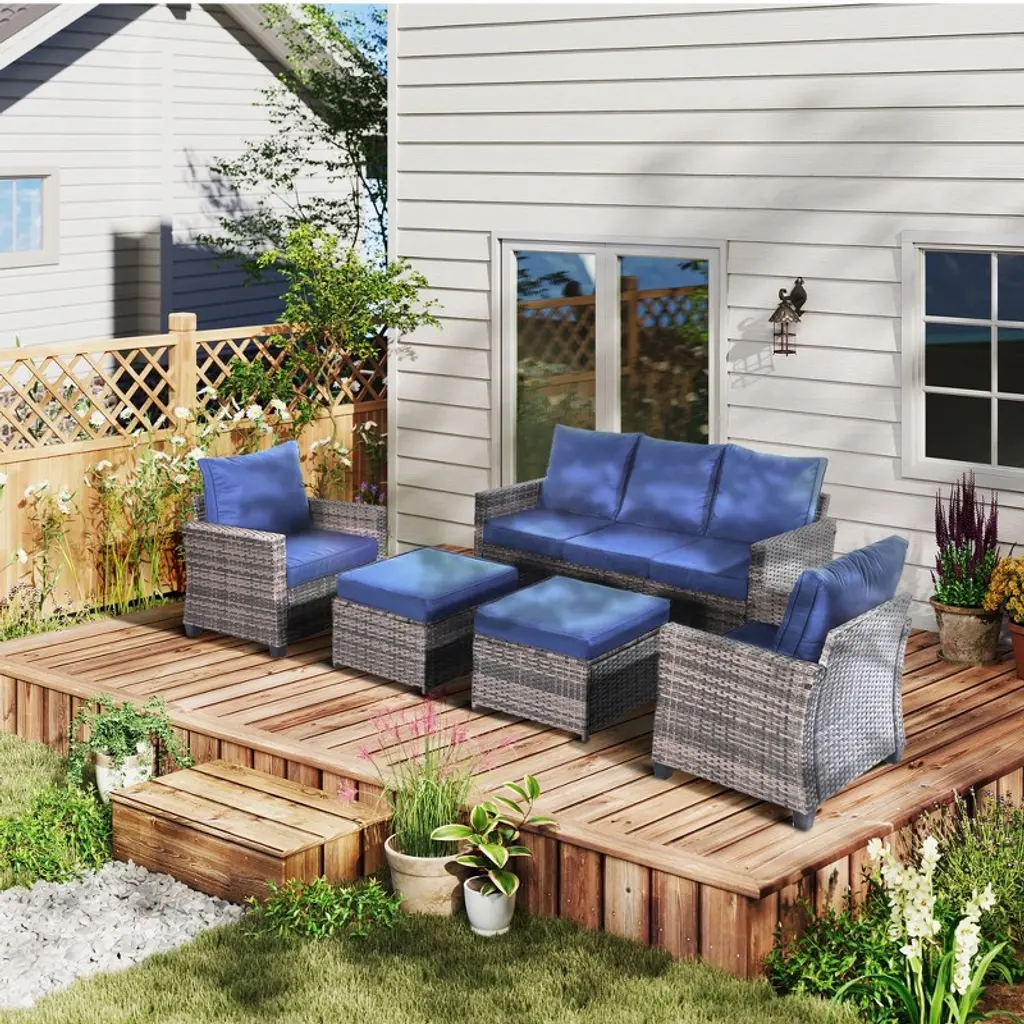 Decksplore 5-piece Patio Furniture Set All-weather Wicker Outdoor Sofa With Navy Cushions, Durable Conversation Set For Deck, Garden