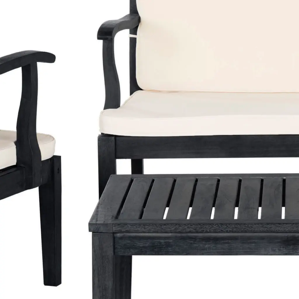 A stylish choice for your favorite outdoor space, this set includes two armchairs, a loveseat, and a coffee table, all crafted of acacia and finished in dark slate gray. The chairs and loveseat feature beautifully structured backs and are each topped with amply padded, all-weather cushions for lasting comfort and support.