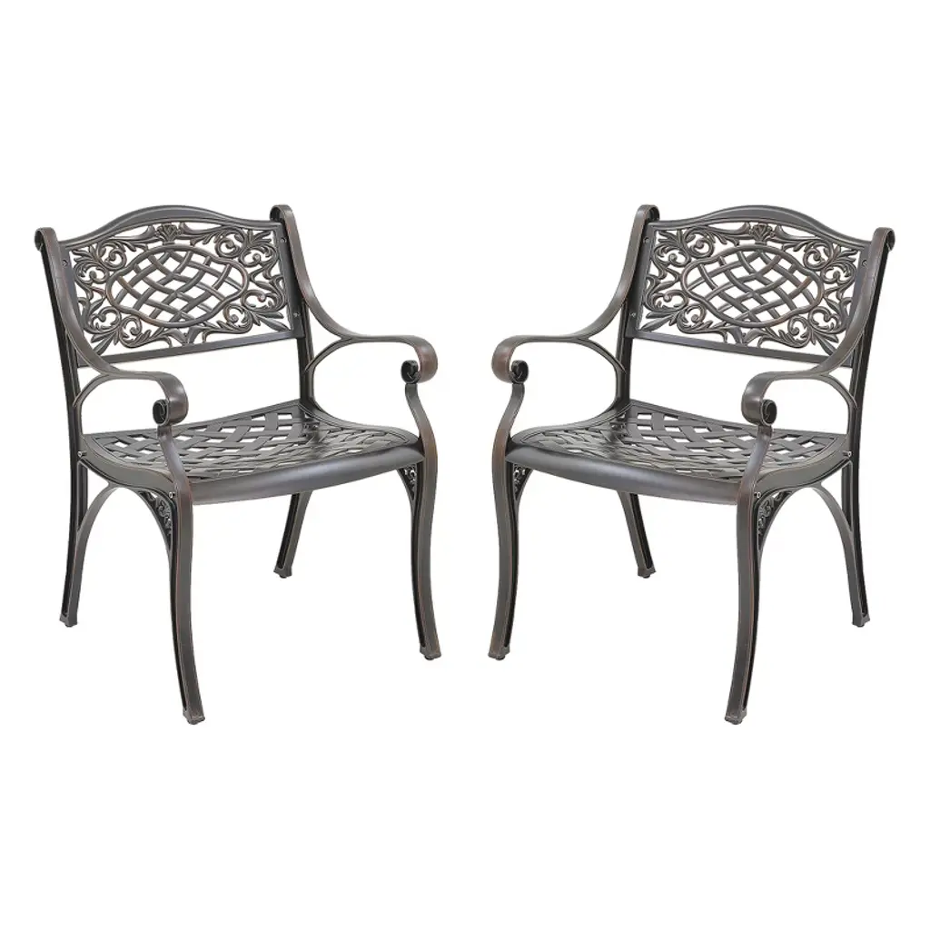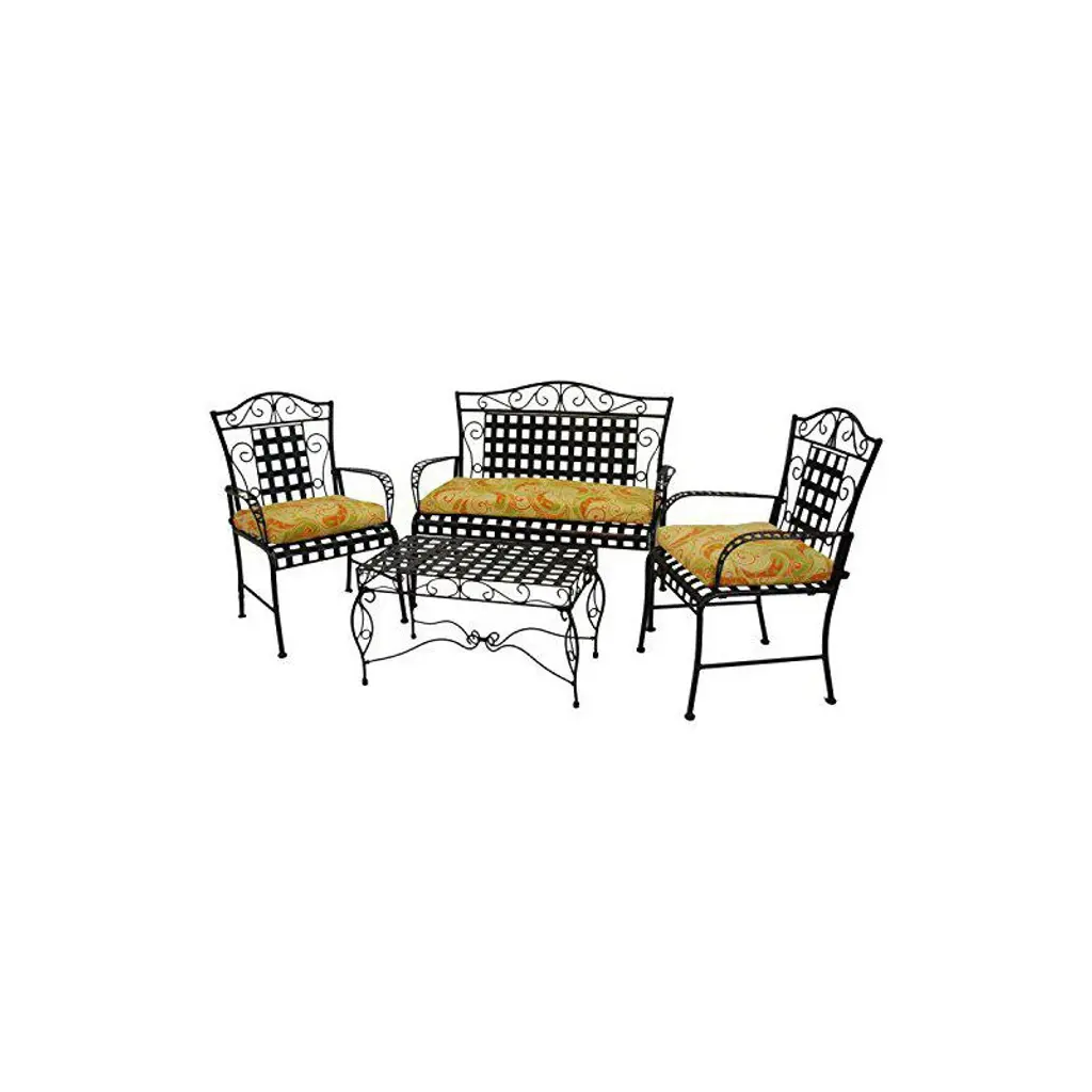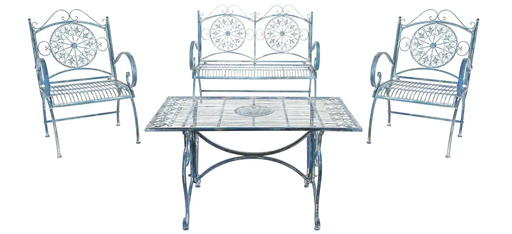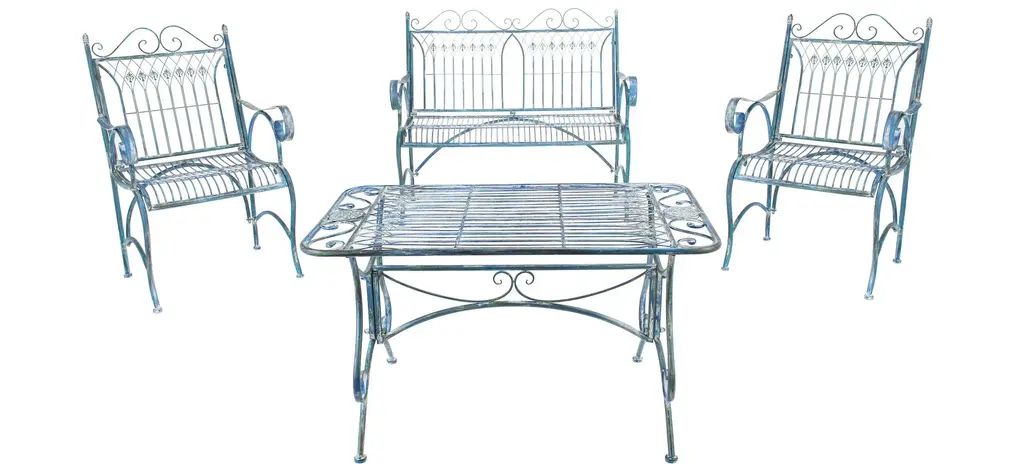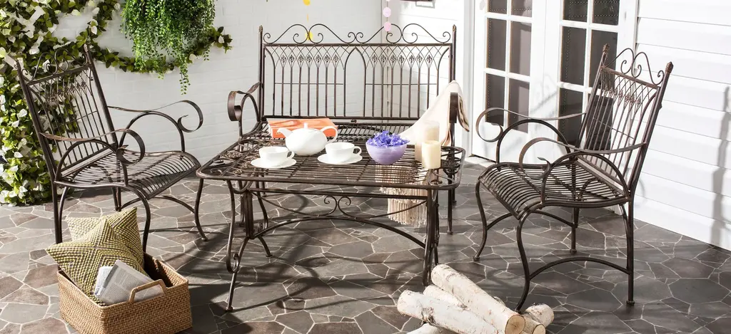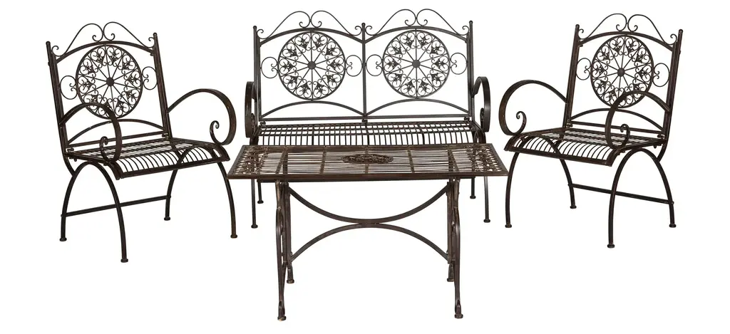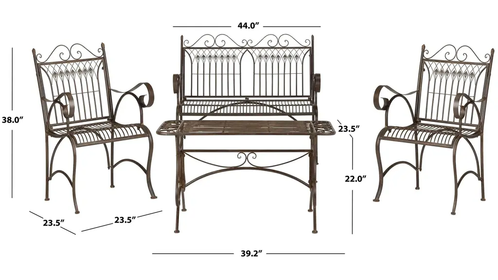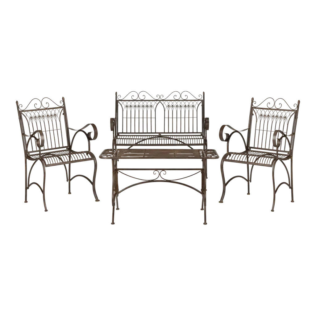 Emanating turn of the century charm, this Dennings 4-pc. Patio Set gives any outdoor area a classic, romantic ambiance. Crafted of intricately worked iron in a rustic finish, Dennings's Victorian inspired scroll details transform your patio into an elegant entertainment space. Includes a loveseat, two chairs, and coffee table.