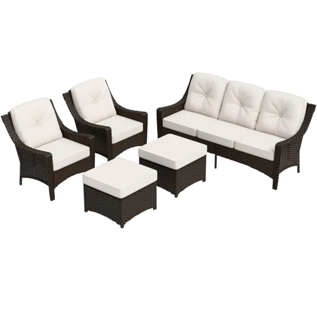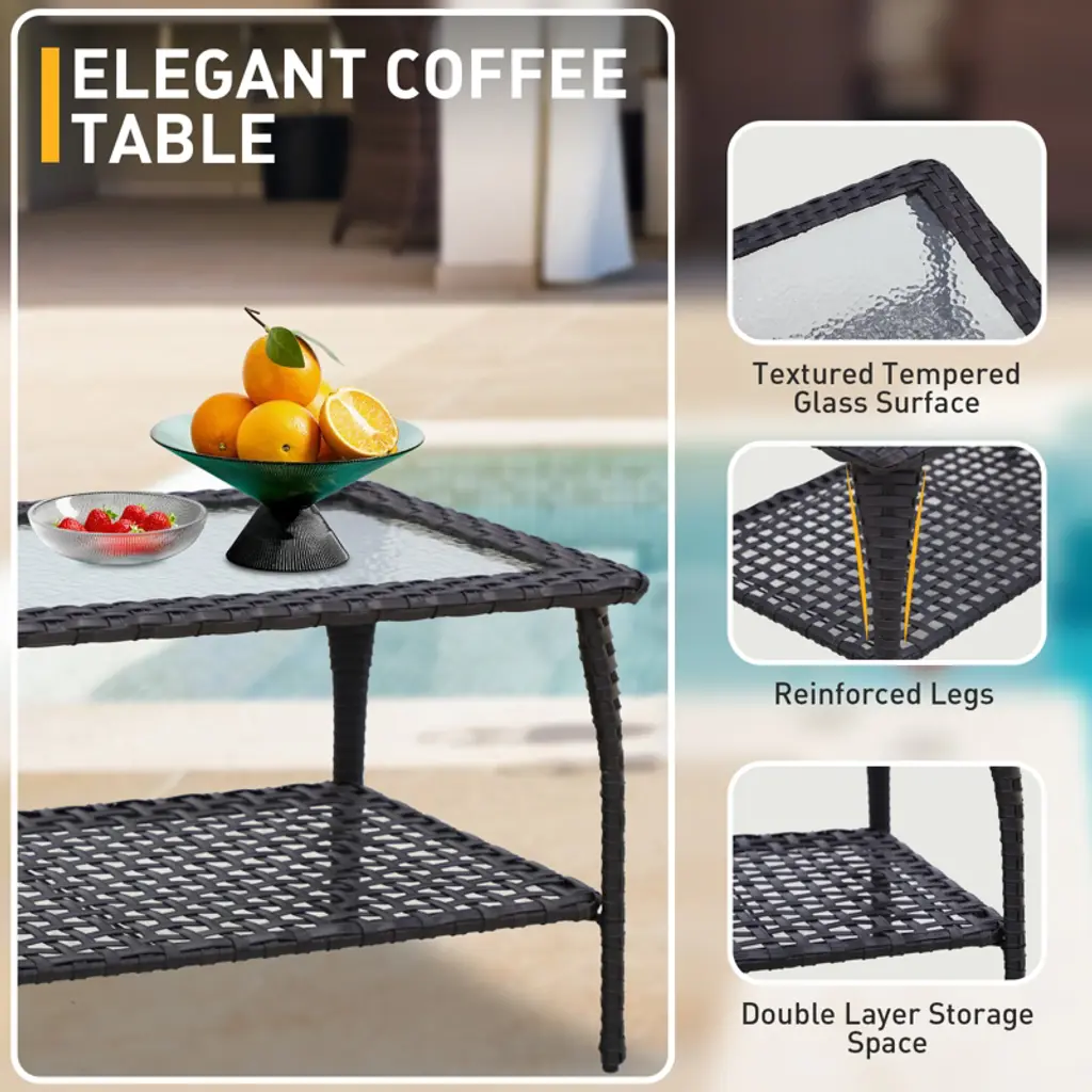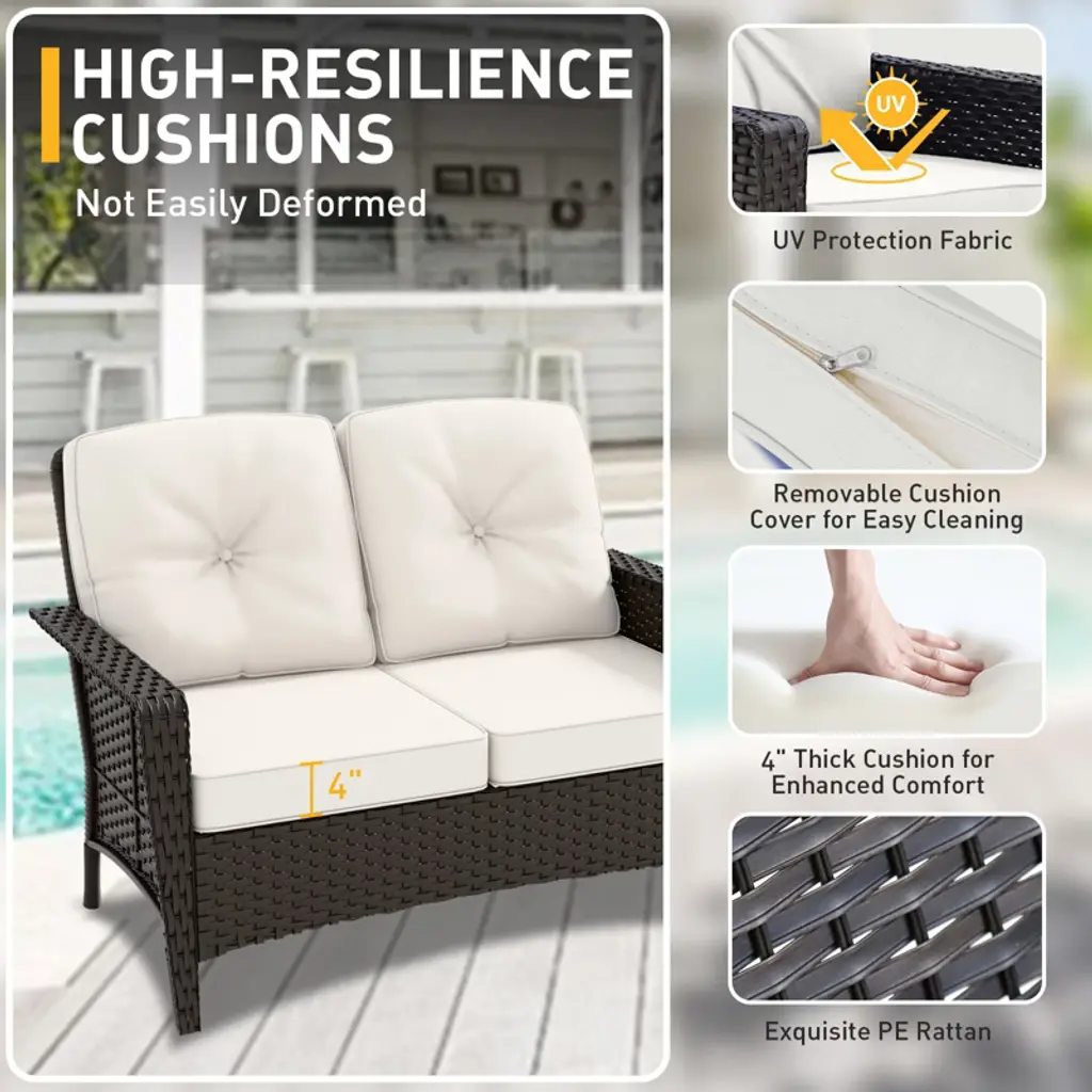 The EAGLE PEAK 4-Piece Outdoor Rattan Patio Set is easy to assemble and features an elegant design. Comfortable and stylish, it enhances any patio, deck, or garden. Includes 2 single chairs, a loveseat, and a coffee table that blend seamlessly with any home decor. The deep seating design boosts comfort, making it perfect for enjoying outdoor time with family and friends.