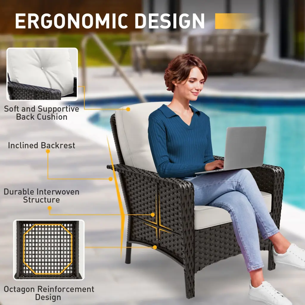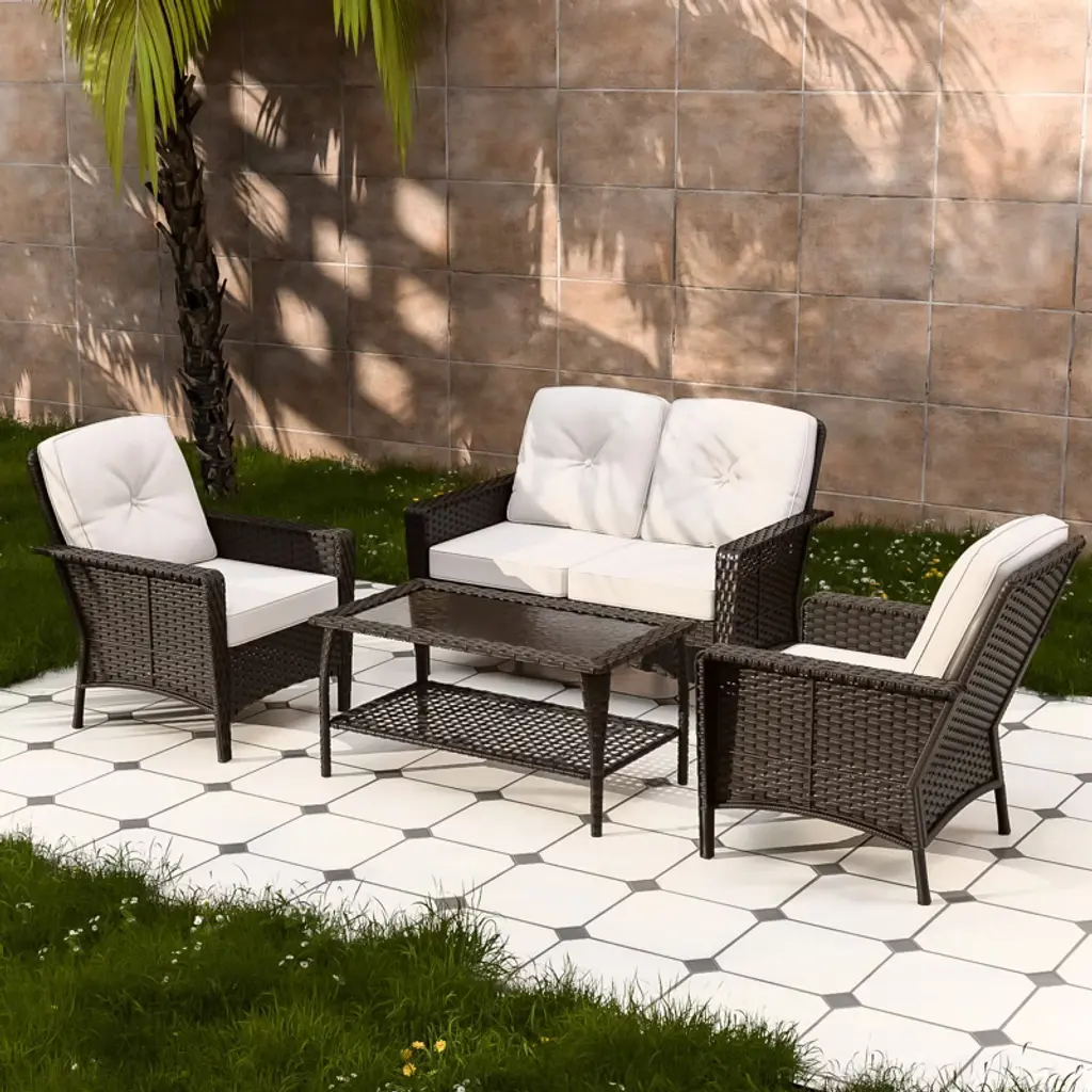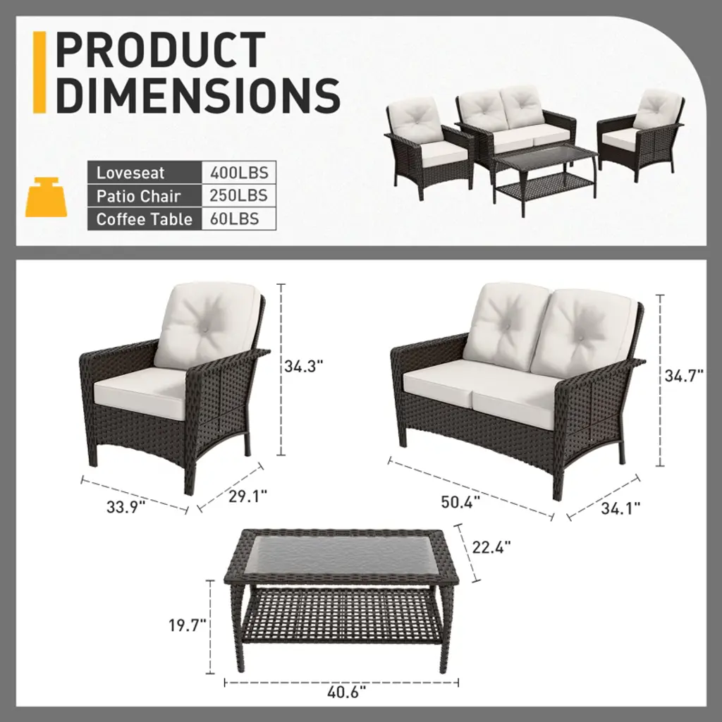 Eagle Peak 4 Piece Patio Rattan Furniture Conversation Set, Wicker Outdoor Couch And Chairs Set With Coffee Table, Beige