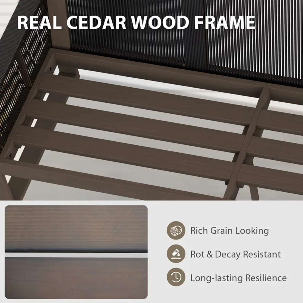 EAGLE PEAK outdoor real wood furniture set is crafted from high-quality cedar wood, known for its natural beauty and durability. Even with prolonged exposure to the elements, it remains in excellent condition. The set includes soft cushions made from high-quality olefin and high-resilience foam, ensuring comfort and breathability. After a busy day, sitting in this chair offers unmatched relaxation. In short, the EAGLE PEAK Outdoor Furniture Set combines beauty and functionality, enhancing your outdoor experience.