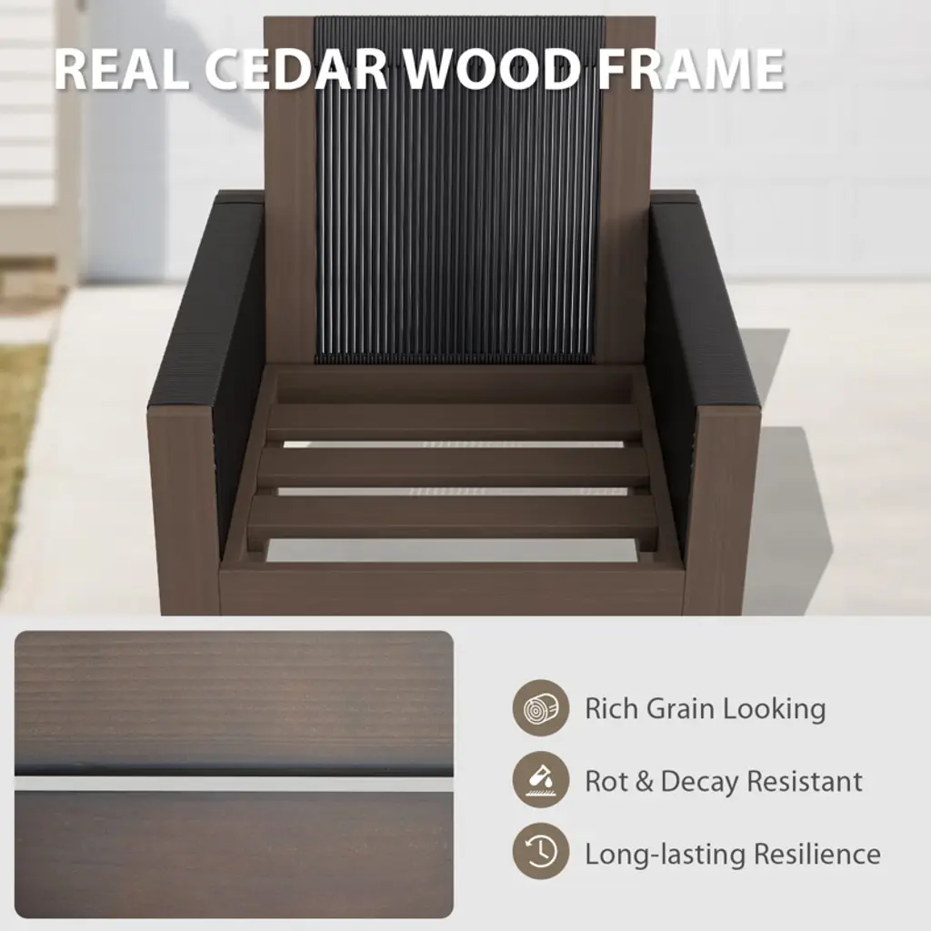 EAGLE PEAK outdoor real wood furniture set is crafted from high-quality cedar wood, known for its natural beauty and durability. Even with prolonged exposure to the elements, it remains in excellent condition. The set includes soft cushions made from high-quality olefin and high-resilience foam, ensuring comfort and breathability. After a busy day, sitting in this chair offers unmatched relaxation. In short, the EAGLE PEAK Outdoor Furniture Set combines beauty and functionality, enhancing your outdoor experience.