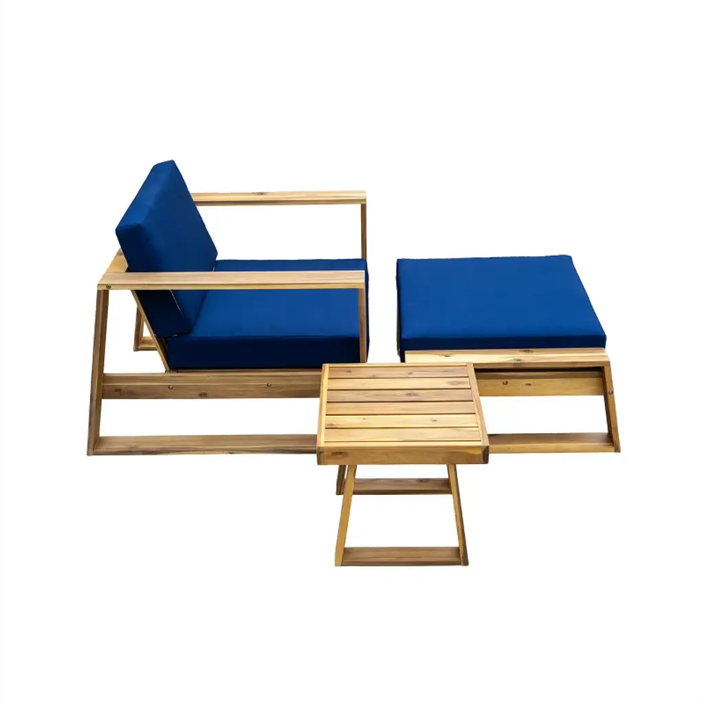 Eljget 3Pcs Patio Chaise Lounge Set With Wooden Chair, Side Table & Ottoman, Outdoor Pool Chair Set, Blue Cushion