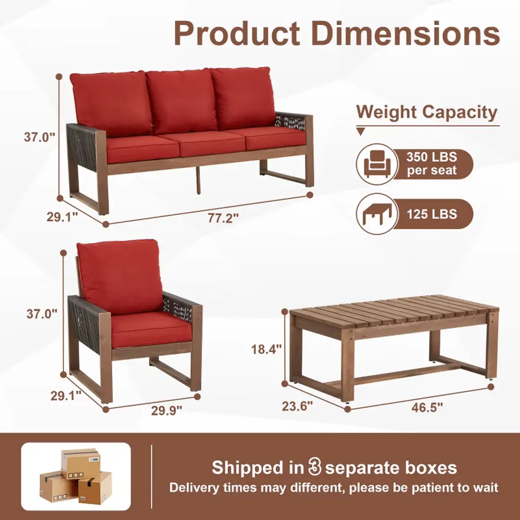 Premium 4-piece cedar patio set featuring weatherproof PE rope accents, 4.7" Olefin cushions, and ergonomic design. Includes 2 chairs, loveseat & coffee table. Ships in 3 easy-to-assemble boxes. Perfect for poolside lounging or backyard entertaining What's Included? 5 Cushion(s) 1 Table(s) 2 Chair(s) 1 Sofa(s)