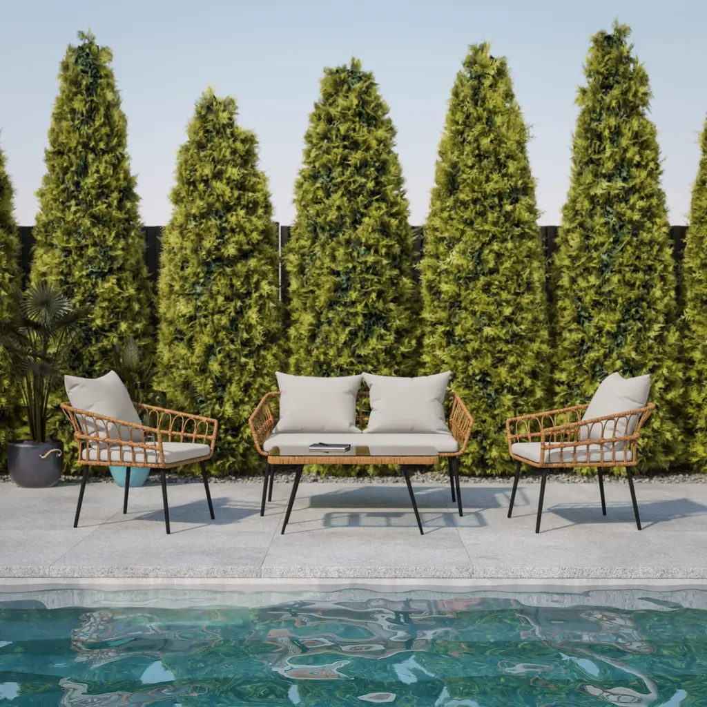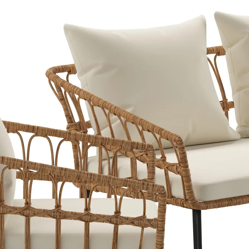 Evin Boho 4 Piece Indoor/outdoor Rope Rattan Patio Conversation Set With Tempered Glass Top Coffee Table And Cushions