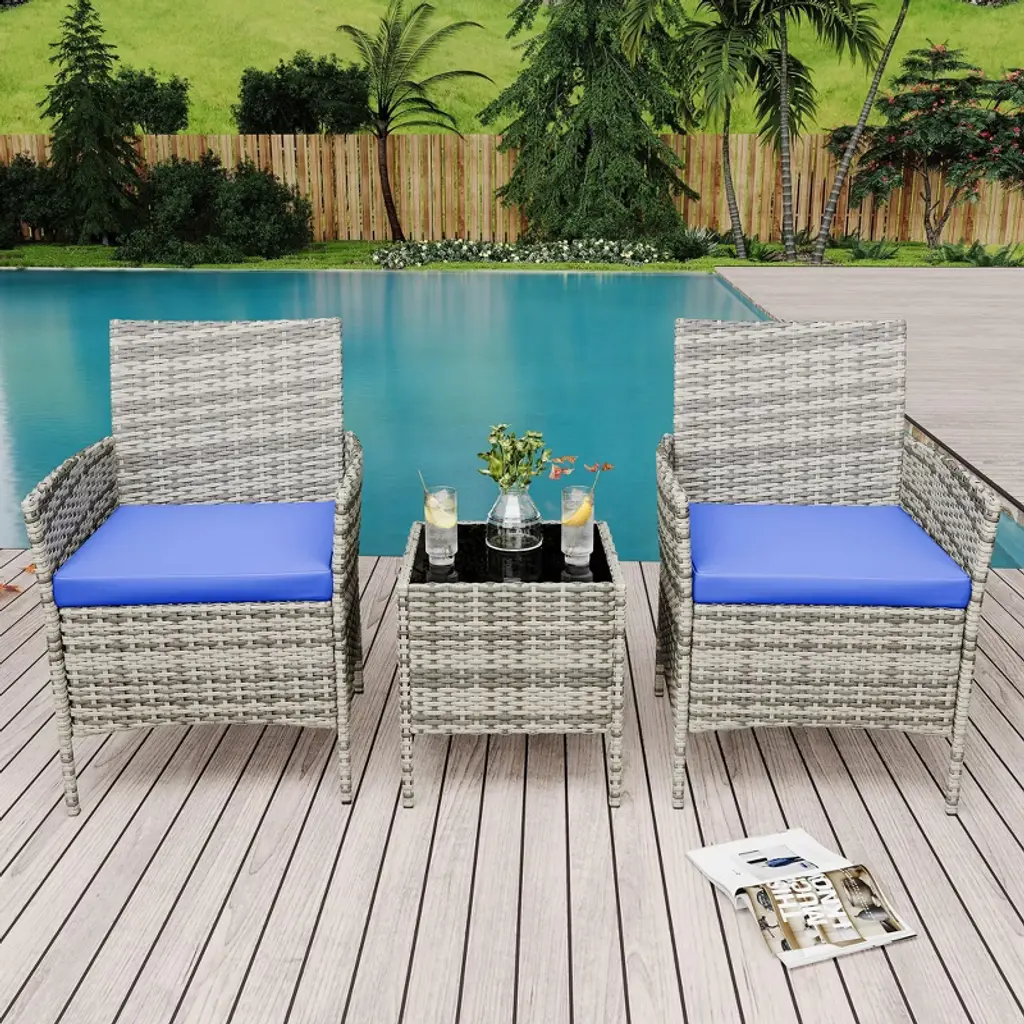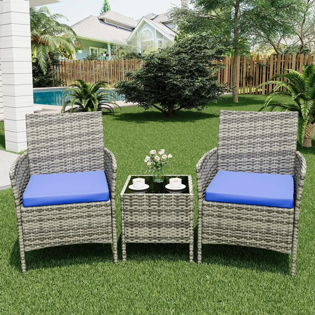 Garvee 3-piece Patio Furniture Set - Wicker Conversation Set With Cushions & Glass Coffee Table, Outdoor Rattan Sofa For Garden, Poolside, Balcony