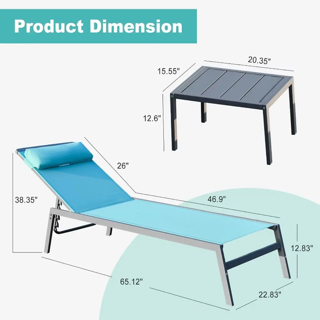 Transform your outdoor space with our Lake Blue 3-Piece Aluminum Patio Chaise Lounge Set. This stylish set features two adjustable lounge chairs and a convenient side table, perfect for relaxing by the pool, on the balcony, or in the garden. Crafted from a sturdy aluminum frame, this lounge set is waterproof and rust-resistant, supporting up to 300 pounds for lasting durability. The high-quality Textilene fabric is water-repellent, UV-resistant, and breathable, ensuring comfort even on the hottest summer days. With five adjustable backrest positions, you can easily customize your lounging experience. Plus, the stackable design allows for easy storage, making it a practical addition to any outdoor setting.