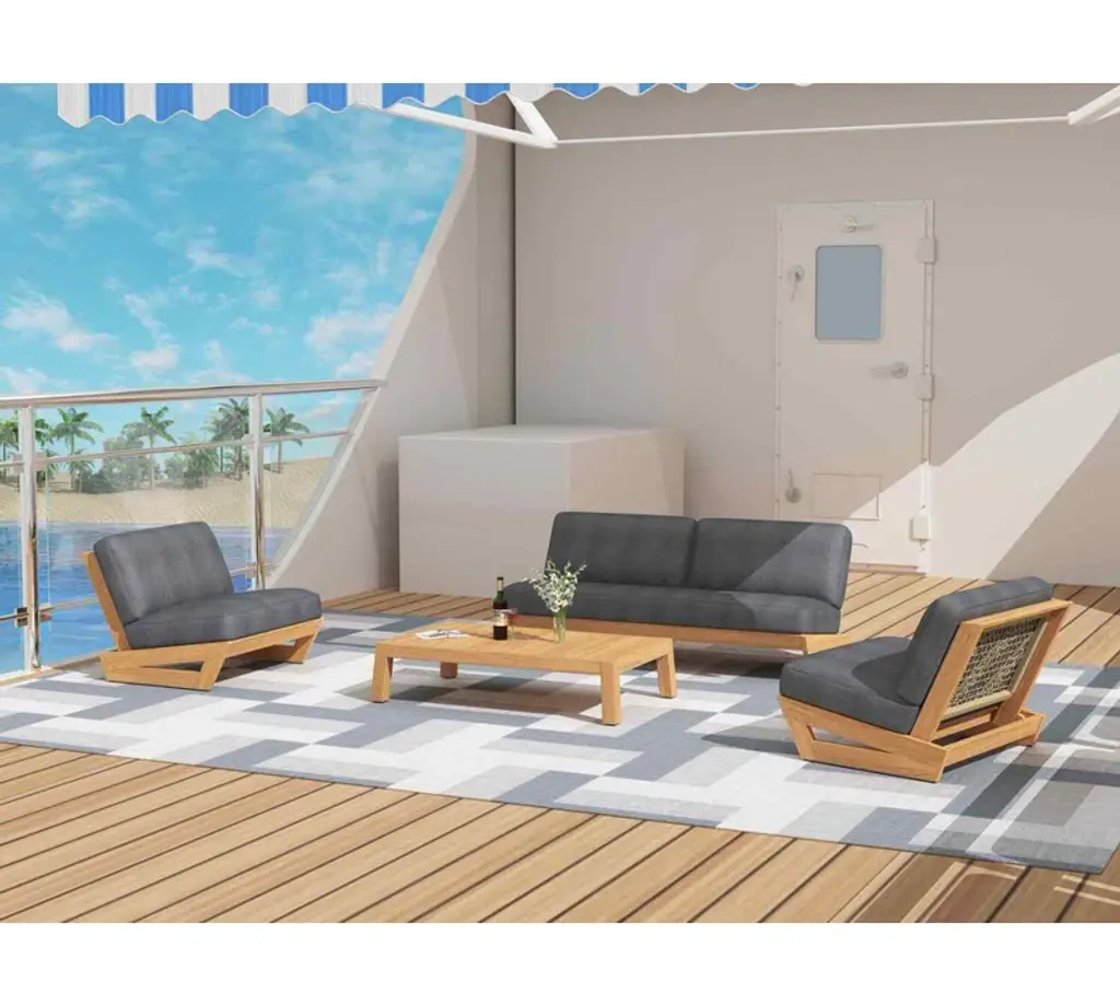 Live outdoors in ultimate comfort! Time to relax with family and friends! This beautiful outdoor 4 piece chat set from the Hadria collection is made from Grade A solid teak and features a modern and sleek design with the comfiest of Hadria cushions.This set really makes a statement!