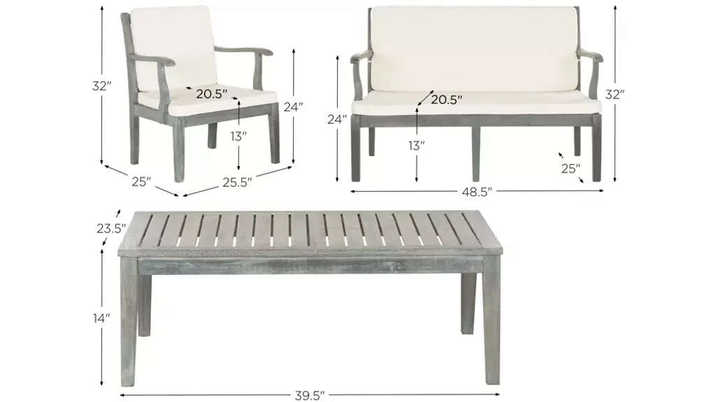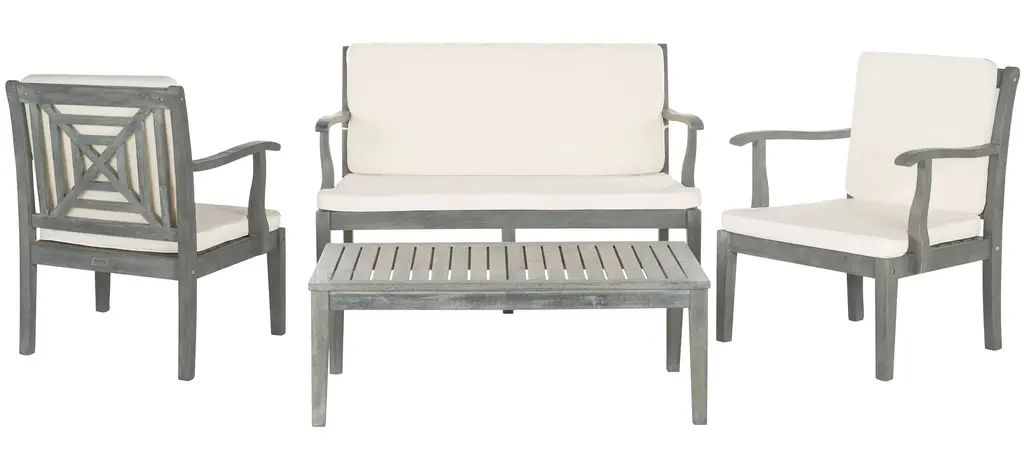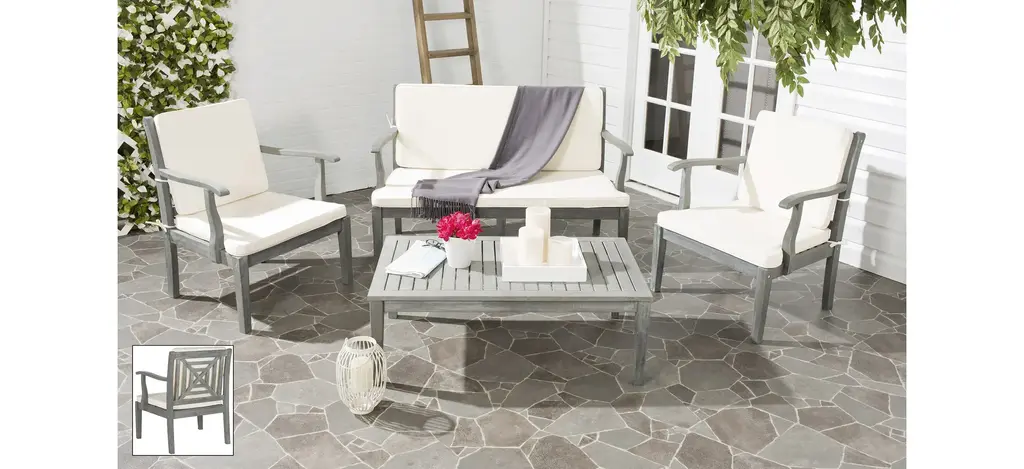 A striking concentric square design with X detail adorns the chairs of the Hilo Mar 4-pc. Patio Set. Masterfully crafted of sustainable finished acacia wood, this sturdy furniture comes with all weather seat and back cushions.