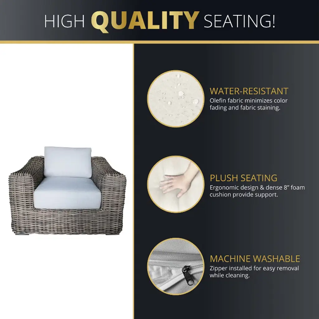 Transform your outdoor space with the Hawaii 4-Piece Wicker Patio Furniture Set, designed for ultimate comfort and lasting durability. This set includes a loveseat, two club chairs, and a coffee table, all featuring a handwoven rattan wicker design that adds a stylish touch to your patio or garden. The powder-coated steel frame ensures robust support, while the poly-wood tabletop offers a modern, low-maintenance surface. The plush 8-inch thick seat cushions, covered in weather-resistant olefin fabric, provide superior comfort, and the machine-washable cushion covers make maintenance a breeze. Perfect for relaxing or entertaining, this set creates an inviting atmosphere for up to four guests. Spot clean for the wicker and enjoy easy care with machine-washable cushions. Best of all, no assembly is required, making it easy to enjoy right away.