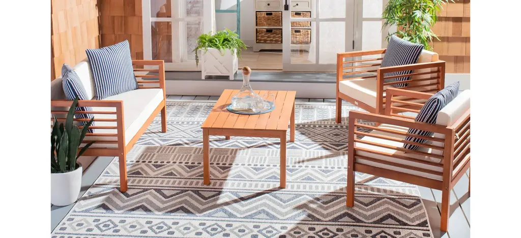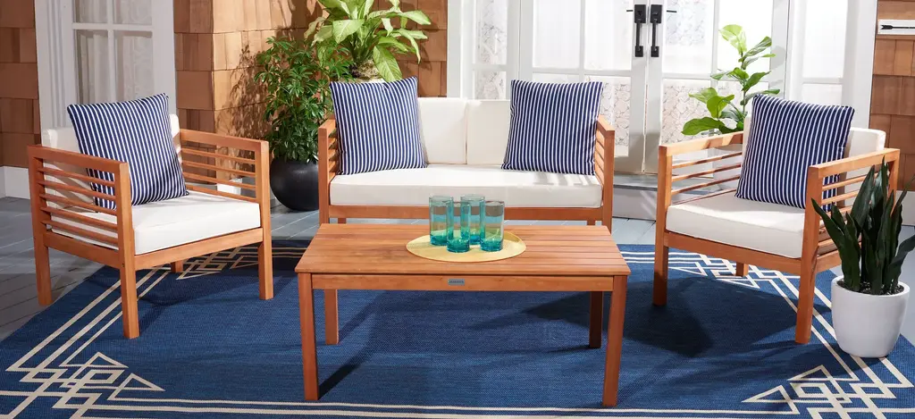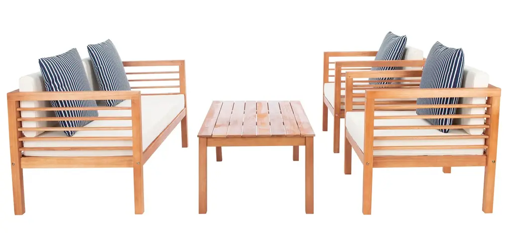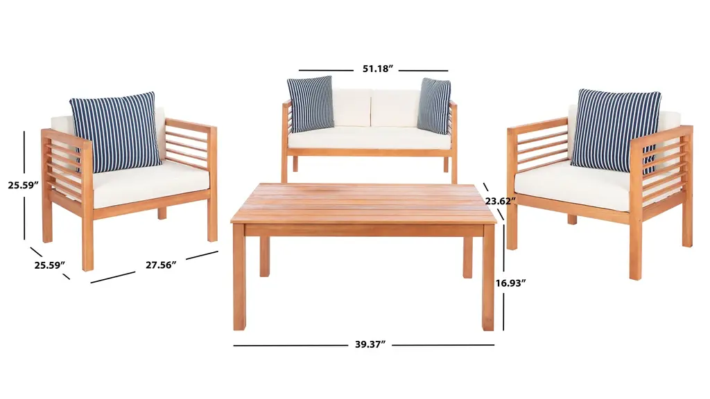 If you are inspired by Barcelona's coastal style, this contemporary Korbin 4-pc. Outdoor Patio Set is just what you are looking for. Designed with chic clean lines, each piece is crafted in a neutral hue and upholstered for timeless appeal. Also includes bold accent pillows in a complementary color.