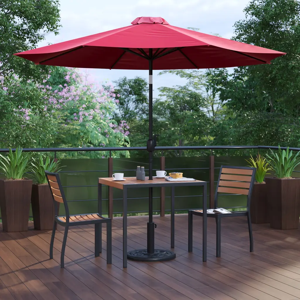 Setting up your outdoor space just got easier with this one stop 5 piece patio set bundle. Refresh the look of your existing entertaining space or add your personal touch to the new house you just moved into. Beautiful synthetic teak slats adorn the faux teak table and chairs while the polyester umbrella, and weatherproof base keep you cool. The trending synthetic faux teak slats contrast beautifully with the metal frames and look great in any space. The 18 gauge steel frame of the patio table and aluminum frame of the patio chairs hold up to 300 Lbs. static weight capacity. The 9ft market umbrella boasts push button tilt. Powder coated frames resist nicks and scratches and are weather-resistant though care should be taken to protect from prolonged wet weather. Assembly for all pieces takes less than 30 minutes. Your new set wipes clean with a water based cleaner. Fixed glides maintain the appearance of your hard flooring surfaces when used indoors.