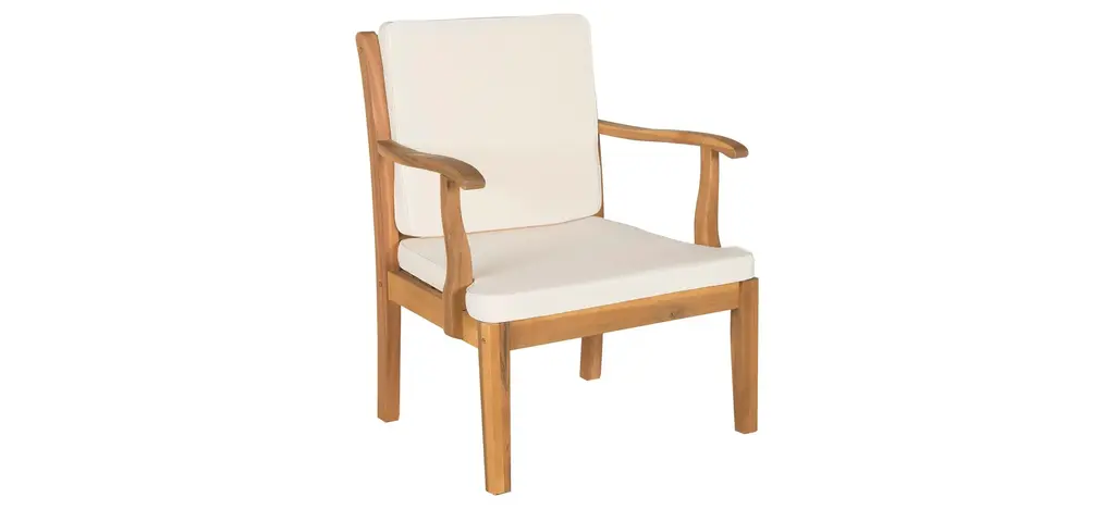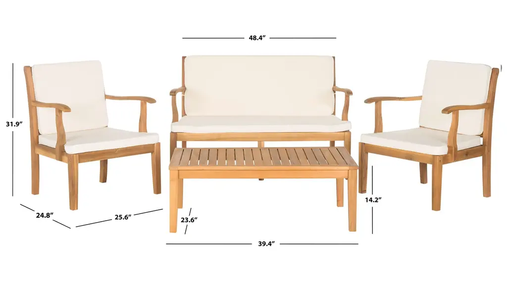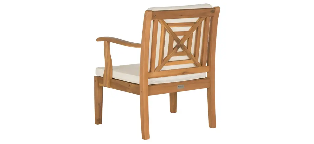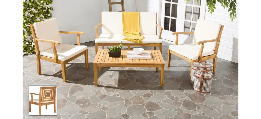 A striking concentric square design with X detail adorns the chairs of the Lovell 4-pc. Patio Set. Masterfully crafted of sustainable acacia wood in natural, this sturdy furniture comes with all weather seat and back cushions.