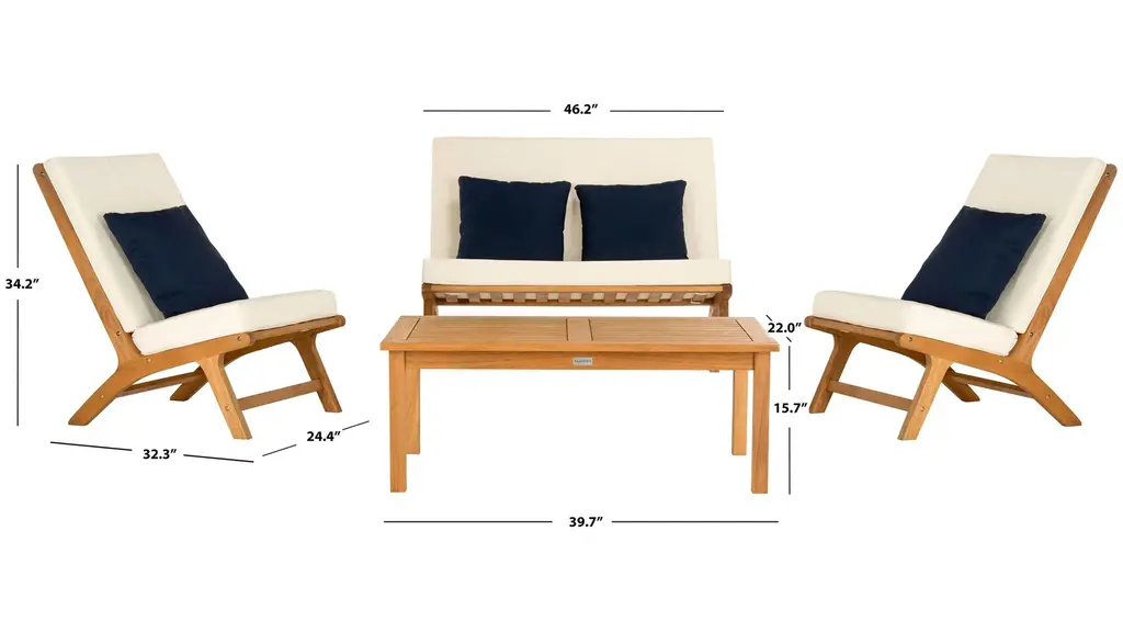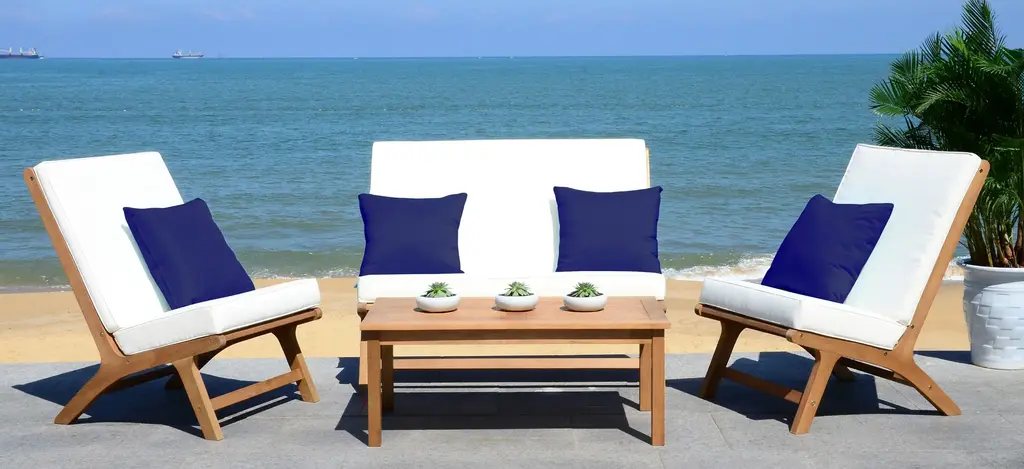 Alive with surf and sand, Sao Paulo's legendary beaches inspired this Micha 4-pc. Patio Set. Crafted in a natural finish, its clean lines and plush upholstery is ideal for afternoon lounging by the pool. Also includes accent pillows in a complimentary color.