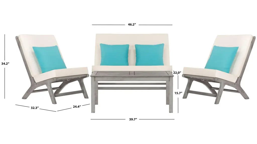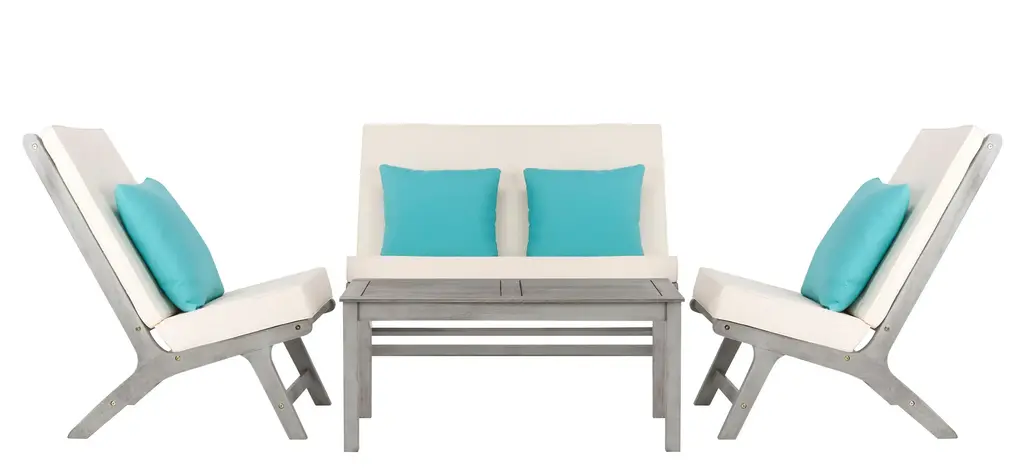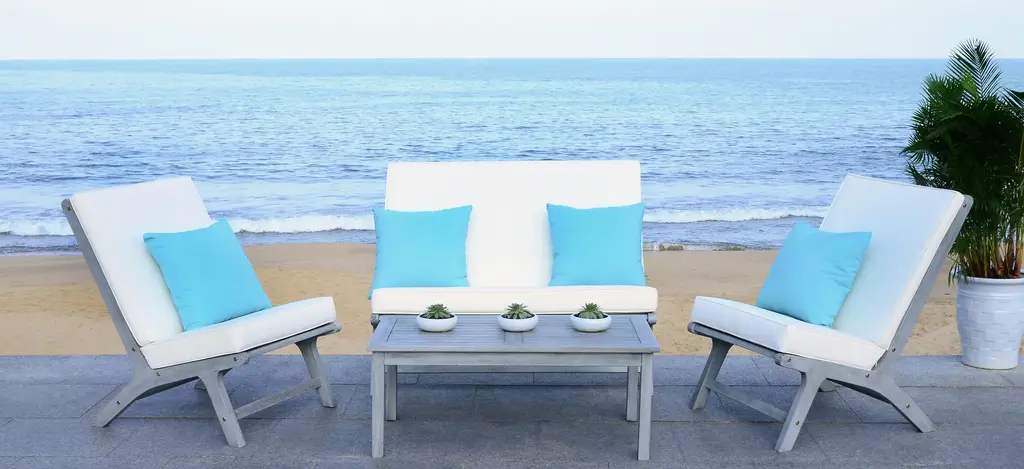 Alive with surf and sand, Sao Paulo's legendary beaches inspired this Micha 4-pc. Patio Set. Crafted in a natural finish, its clean lines and plush upholstery is ideal for afternoon lounging by the pool. Also includes accent pillows in a complimentary color.