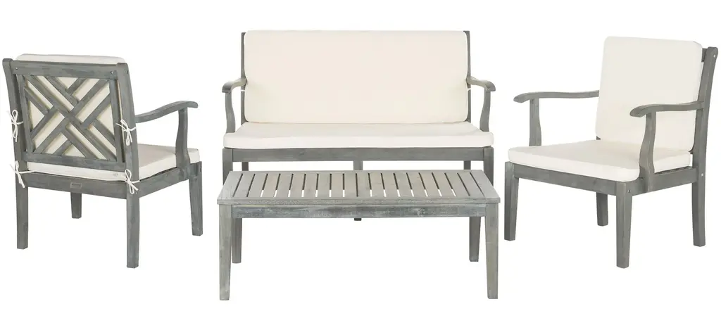 An English garden furniture classic inspired the Milan 4-pc. outdoor patio set with crosshatch seat back detail. Sustainable acacia in a natural finish is used for a coffee table and seating with seat and back cushions of all weather fabric.
