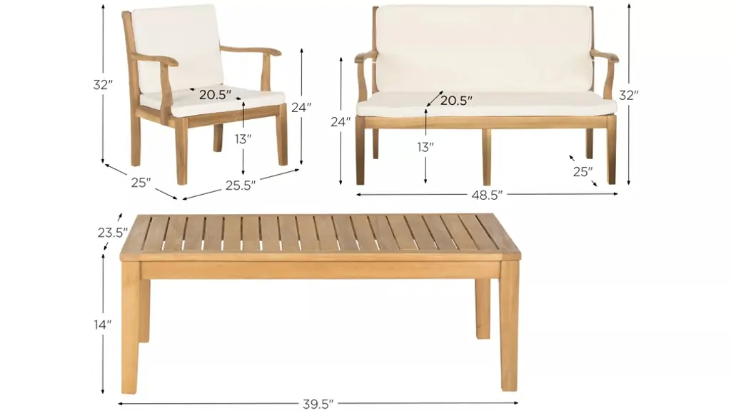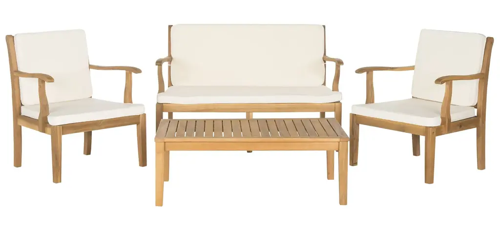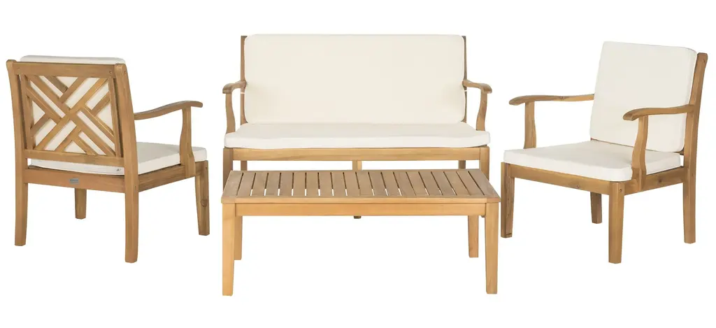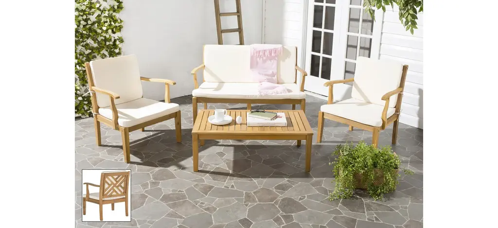 An English garden furniture classic inspired the Milan 4-pc. outdoor patio set with crosshatch seat back detail. Sustainable acacia in a natural finish is used for a coffee table and seating with seat and back cushions of all weather fabric.