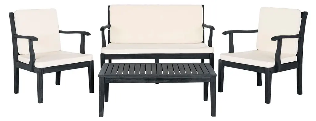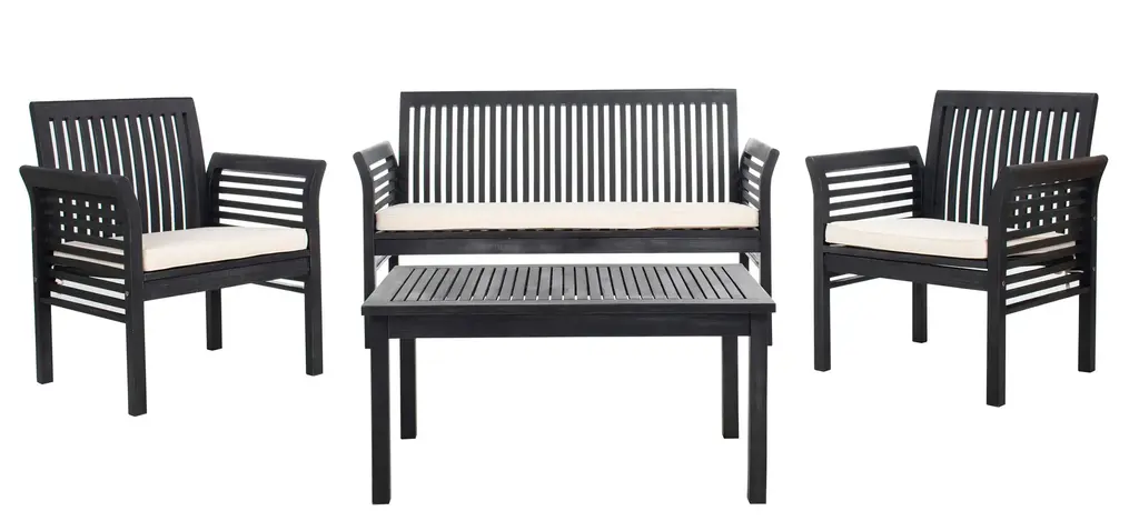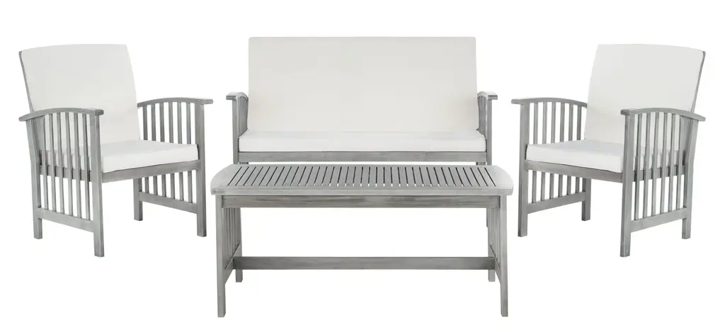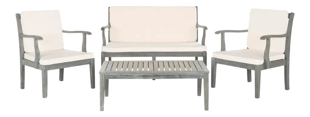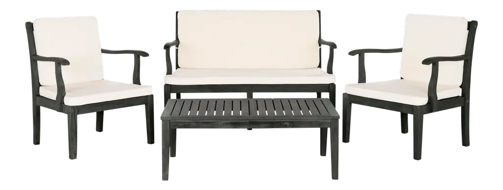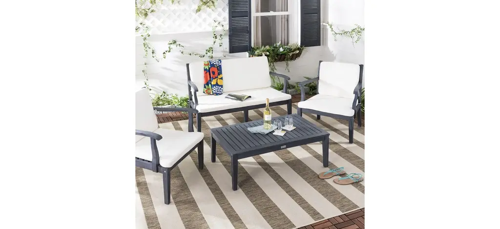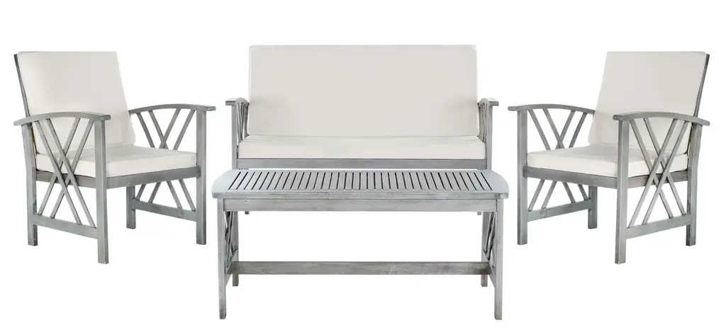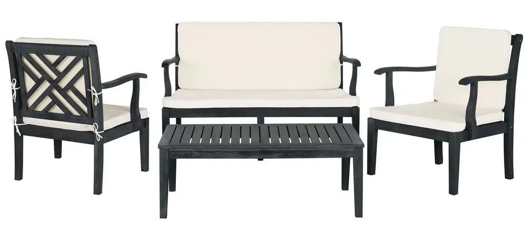An English garden furniture classic inspired the Milan 4-pc. outdoor patio set with crosshatch seat back detail. Sustainable acacia in a natural finish is used for a coffee table and seating with seat and back cushions of all weather fabric.