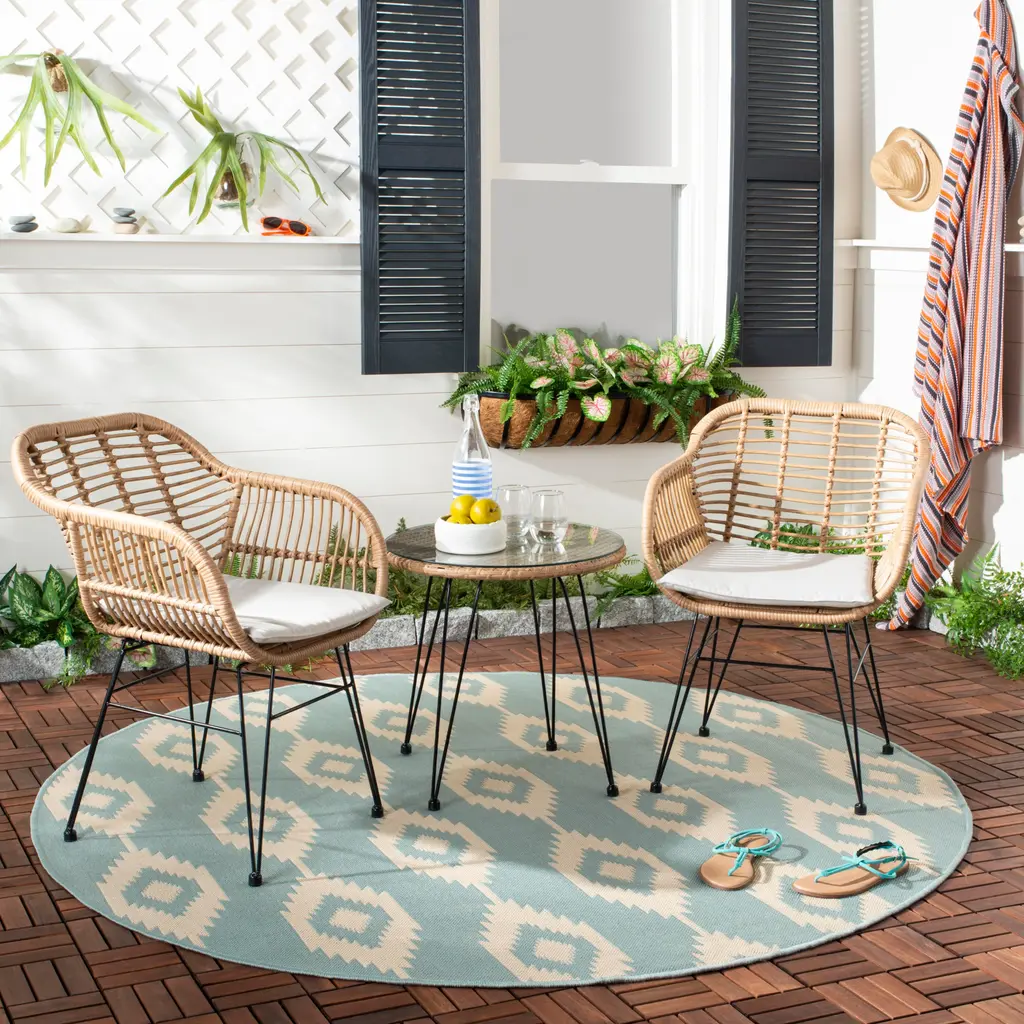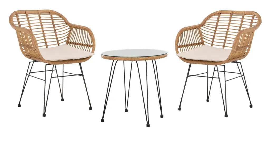 Whether it’s a alfresco lunch on the terrace or a romantic moonlight dinner, this contemporary 3-piece lounge set is a must-have for outdoor living. Crafted with light brown rattan, it chic retro hairpin legs bring fresh modern style to any soiree. Store outdoor furniture indoors or cover well when not in use. Remove wooden furniture from standing water. Dust regularly with small brush or vacuum. Spills should be taken care of immediately before they harden or stain with a slightly dampened sponge. Do not use bleach solutions. Some assembly required. Individual Dimensions: CHAIR (2): 22 x 27 x 31.5 TABLE (1): 20.5 x 20.5 x 21.3