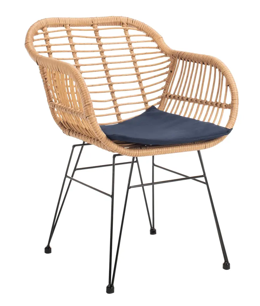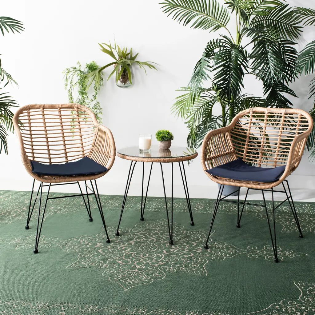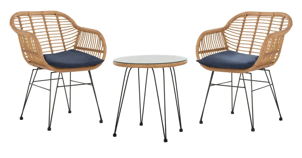 Whether it’s a alfresco lunch on the terrace or a romantic moonlight dinner, this contemporary 3-piece lounge set is a must-have for outdoor living. Crafted with light brown rattan, it chic retro hairpin legs bring fresh modern style to any soiree. Store outdoor furniture indoors or cover well when not in use. Remove wooden furniture from standing water. Dust regularly with small brush or vacuum. Spills should be taken care of immediately before they harden or stain with a slightly dampened sponge. Do not use bleach solutions. Some assembly required. Individual Dimensions: CHAIR (2): 22 x 27 x 31.5 TABLE (1): 20.5 x 20.5 x 21.3