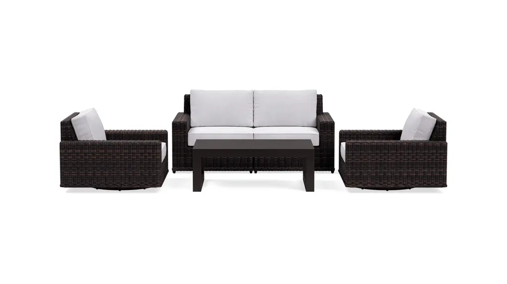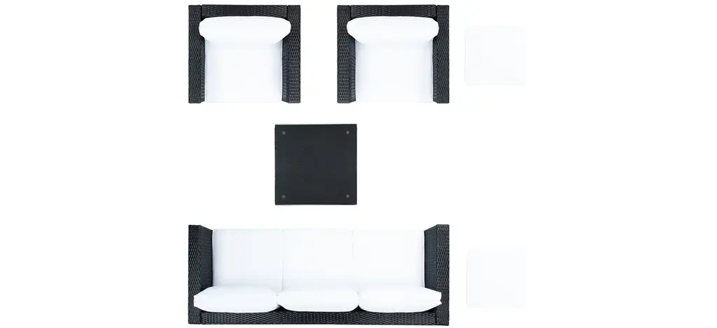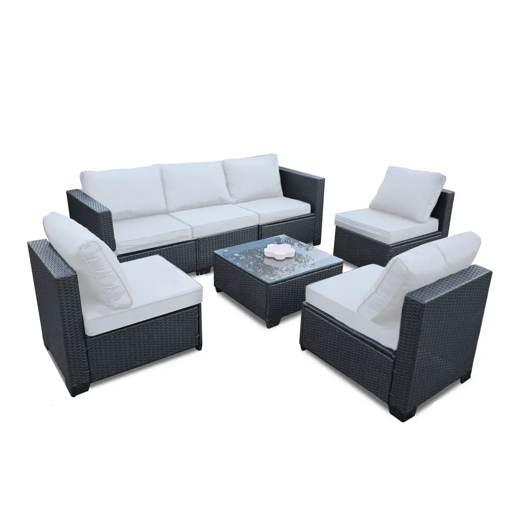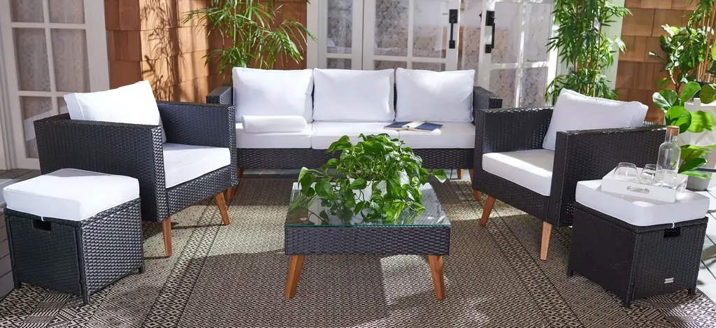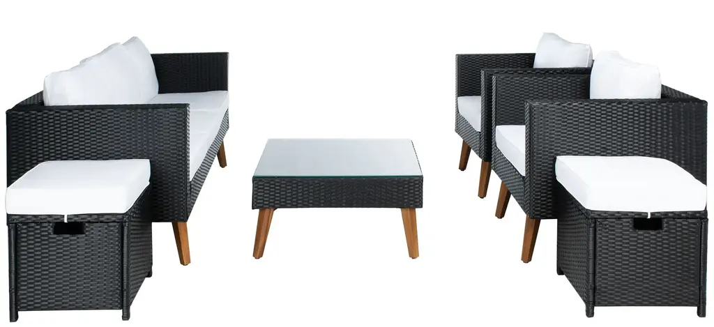 Retro minimalism goes modern coastal in this Montclair 6-pc. Patio Set. Including two cushioned ottomans, two armchairs, one sofa, and a glass topped coffee table. The wicker frames are perfectly paired with Mid Century acacia legs, making for stylish, luxurious outdoor decor.