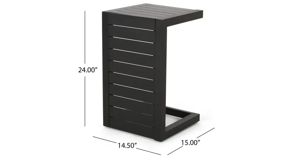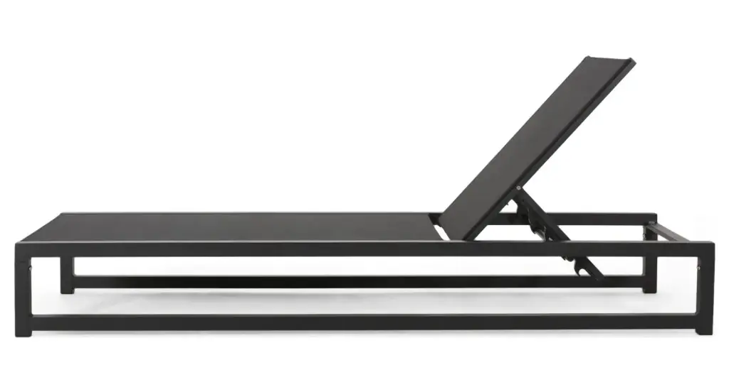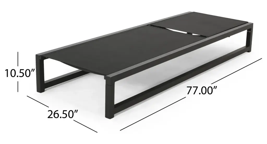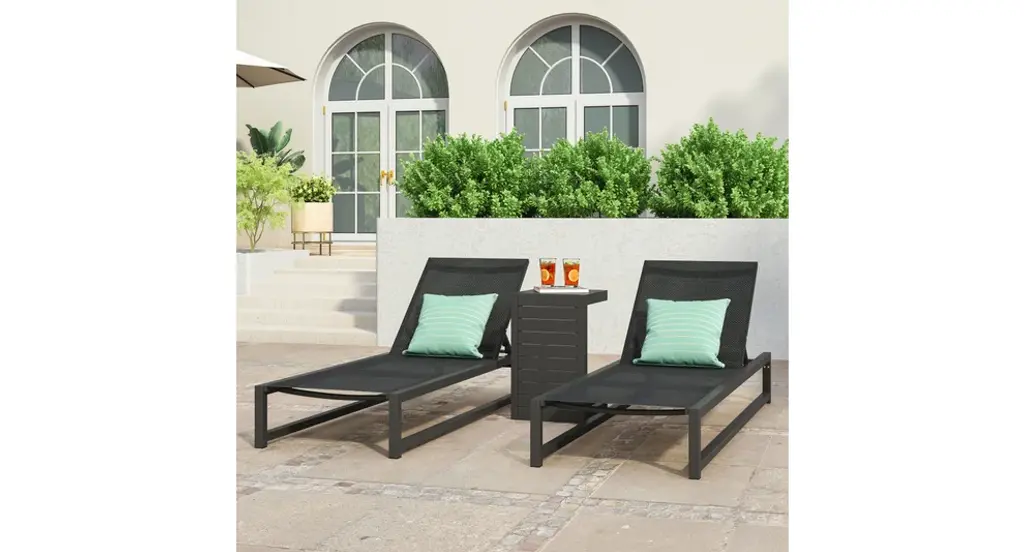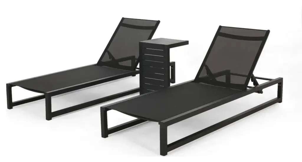 Ultimate relaxation starts here with a chaise lounge and table set that brings you everything you need to enjoy the great outdoors. Featuring breathable mesh seats and sturdy aluminum frames, this set offers ultimate comfort and stability. Including a sleek C-shaped table to hold a chilled drink or two, this charming outdoor set allows you to treat yourself to a world of luxurious contentment. Our delightful set offers both function and style that allows you to make the most of your outdoor space with the least amount of effort.ALUMINUM FRAME: This chaise lounge set is built with aluminum, creating a lightweight and stable frame. This material is rust-resistant which will further extend the life of your product.MESH SEATING: This features seating constructed of outdoor mesh material, making our chaise lounges both flexible and supportive. This lightweight material allows air to circulate and ventilates body heat on a hot day.ADJUSTABLE: Our chaise lounge set offers adjustable seating to ensure maximum comfort. This chaise accommodates five different positions, including a fully reclined option.C-SHAPE TABLE: Perfect for use while seated on these chaise lounges, the C-shape design of our end table allows you to pull this over your seating space without any sacrificing leg room. You can also use this table as a regular side table, making this piece conveniently versatile.DIMENSIONS: Choose an accessory that is the perfect size for you and your furniture. Each chaise lounge is 77.00" W x 26.50" D x 10.50" H and can open up to 77.10" W x 26.70" D x 34.25" H. The table is 14.50" W x 15.00" D x 24.00" H. You will love how much your space can transform with the simple addition of this charming lounge and table set.Includes: Two (2) Chaise Lounges and One (1) Side TableMaterial: Outdoor MeshFrame Material: AluminumTable Material: AluminumFinish: BlackHand-Crafted DetailsAssembly RequiredChaise Lounge Dimensions: 77.00 inches deep x 26.50 inches wide x 10.50-34.25 inches highTable Dimensions: 15.00 inches deep x 14.50 inches wide x 24.00 inches high
