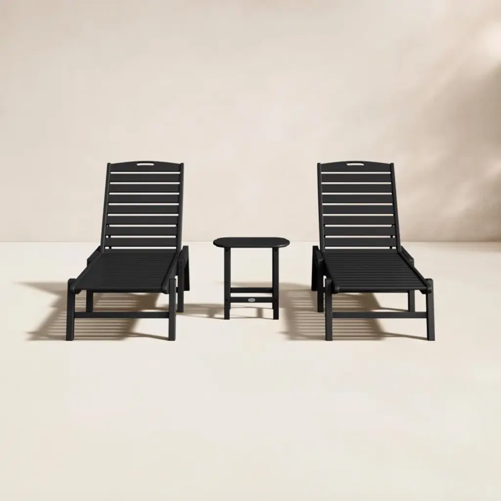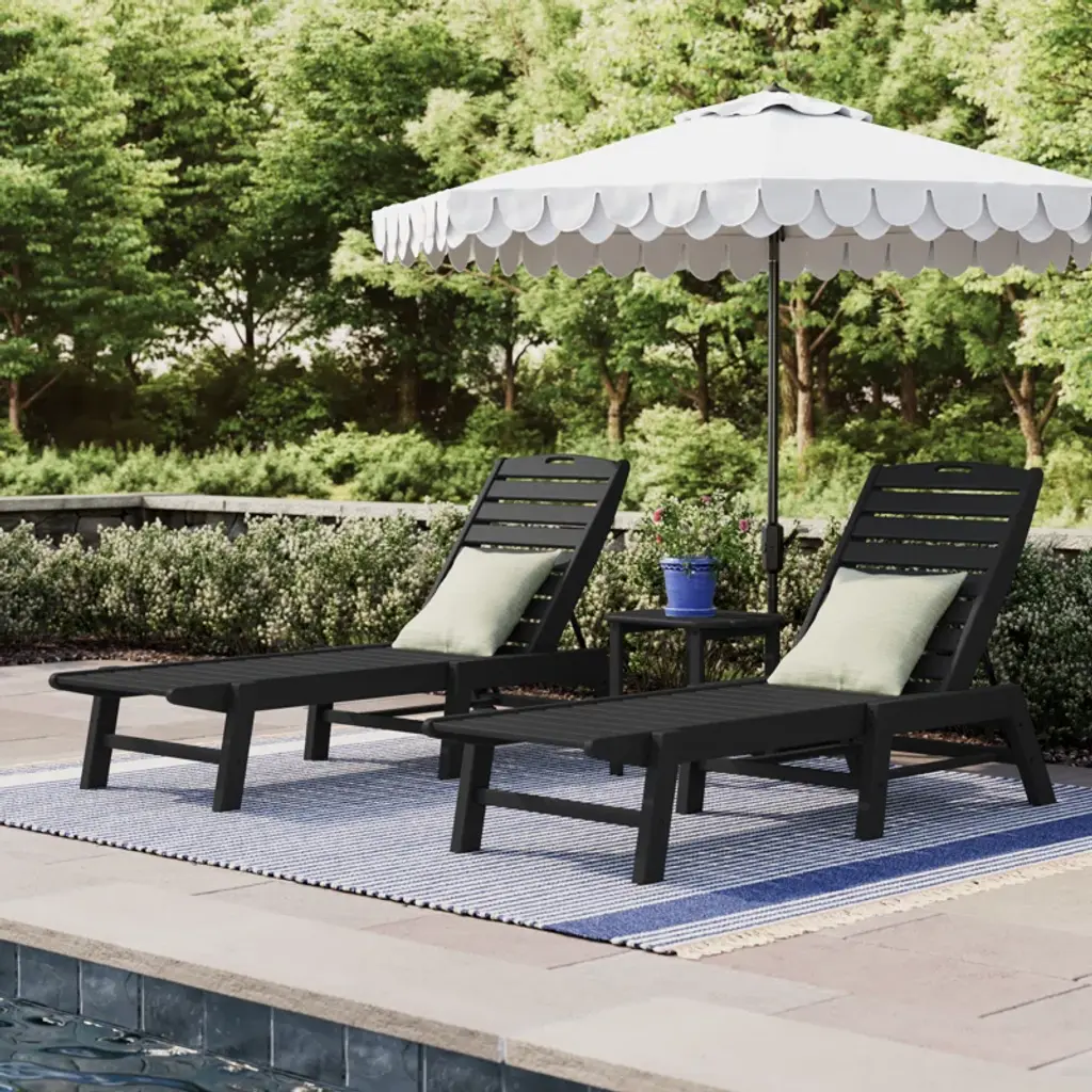 This 3-piece patio lounge set is your ticket to ultimate relaxation in your outdoor space. Crafted from weather-resistant plastic, this set includes two chaise lounges and a side table, making it a great spot for soaking up the sun or enjoying a good book. The chaise lounges feature a reclining design that can lay completely flat, offering versatility and comfort for sunbathing or napping. The included table provides a handy spot for your drink or sunscreen. With UV- and fade-resistant materials, this set is ready to withstand the elements, ensuring it stays looking fresh season after season.