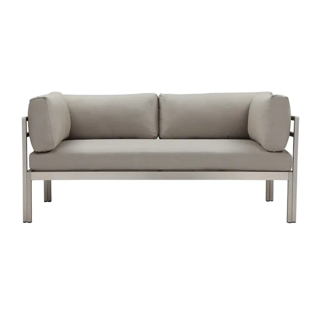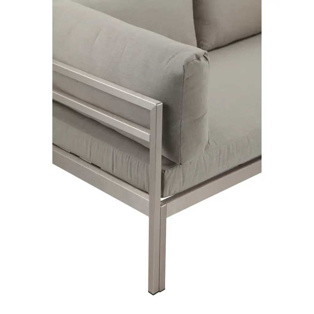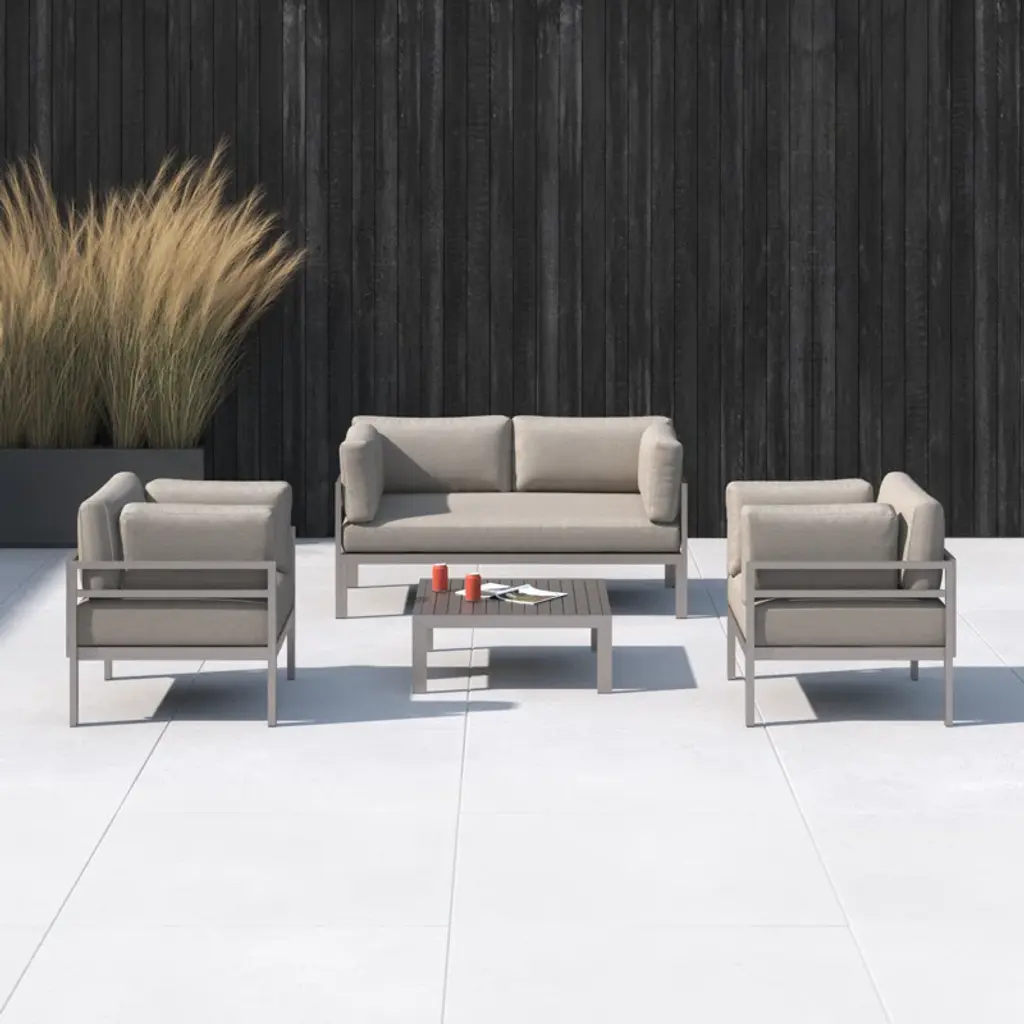 Displaying sleek geometric lines + a neutral palette, this outdoor set gives modern minimalism its day in the sun. The table features a breezy slatted surface, while the chairs + sofa are softened by plush cushions in machine-washable covers. Each piece is built to last from rust-resistant aluminum.