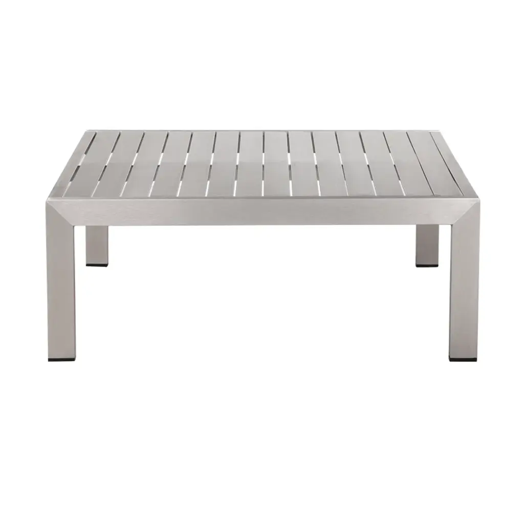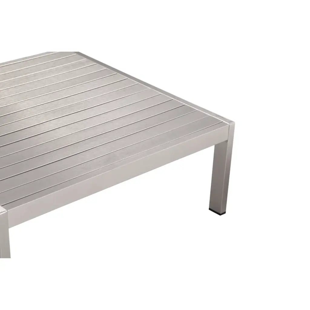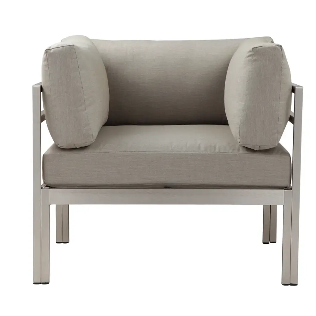 Displaying sleek geometric lines + a neutral palette, this outdoor set gives modern minimalism its day in the sun. The table features a breezy slatted surface, while the chairs + sofa are softened by plush cushions in machine-washable covers. Each piece is built to last from rust-resistant aluminum.