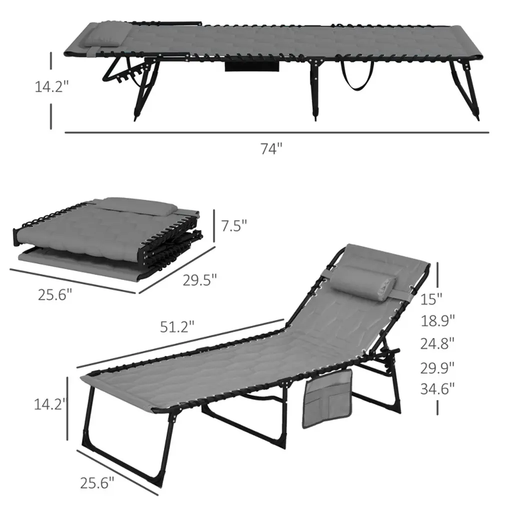 Paged Folding Chaise Lounge Set Portable Lounge Chair Outdoor With Padded Seat, Side Pocket For Camping, Beach, Party, Picnics, Patio, Gray